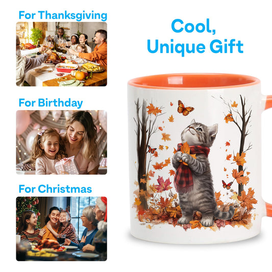Hyturtle Fall Cat Maple Leaves Coffee Mug with Spoon, Birthday Gifts For Cat Lovers, Fall Autumn Decor Gifts For Farmhouse Thanksgiving, Cute Autumn Mug, 11oz Two Tone White Ceramic Coffee Tea Cup