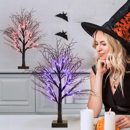 2 Pack Halloween Tree, Vanthylit Black Tree with Orange Purple Bi-Color Led Lights 6 Functions, USB & Battery Operated Lighted Willow Branch for Indoor Halloween Decorations (22 inch,24 LED)
