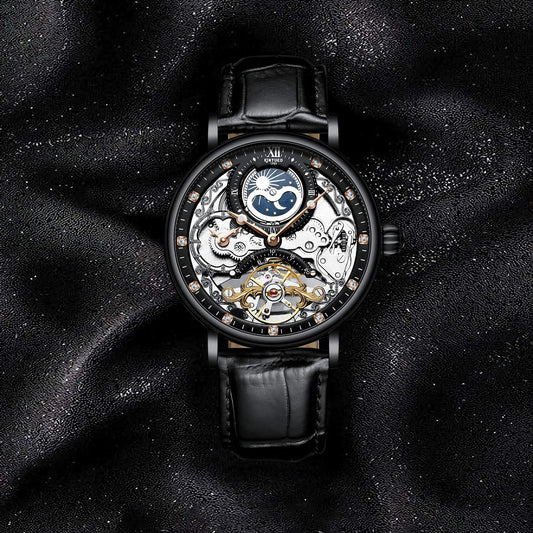 IK COLOURING Mens Luxury Skeleton Automatic Mechanical Wrist Watches Leather Moon Phrase Luminous Hands Self-Wind Watch