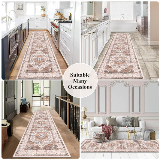 Ileading Vintage Runner Rug for Hallway,Machine Washable Carpet Runners with Rubber Backing,Non Slip Kitchen Floor Mat for Entryway Bedroom Laundry Living Room(Beige&Orange 2x8ft)