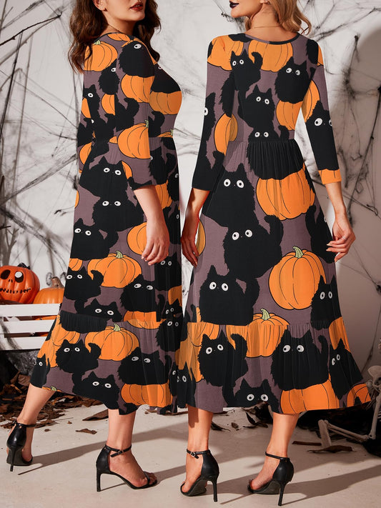 LARACE Halloween 3/4 Sleeve Dresses for Women Plus Size Casual Long Maxi Fall Winter Dress with Pockets(Halloween Pumpkin Cat 2X)