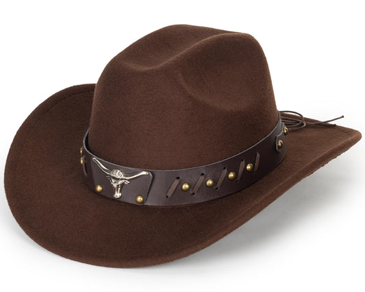 Womens Western Cowboy Hats Studded Pinched Western Cowgirl Hats Wide Brim Fedoras Hat with Belt Buckle (Size:Medium) Brown