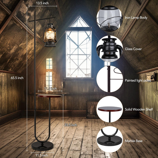 workluurop Vintage Floor Lamp with Table,Classical Lantern Standing Rustic Farmhouse Nightstand Hanging Arc Floor Lamp with Black Silver Finish,for Living Room,Bedroom,Reading Room(Silver)