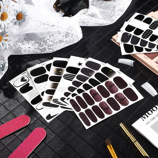 140 Pcs 10 Sheets Black Full Wrap Nail Stickers Polish Strips Gradient Stickers Glitter Self Adhesive DIY Art Decals Strips with 2 Pcs Nail Files for Halloween Decor (Retro Style)