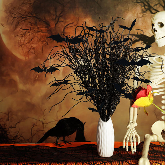 16 Pcs Artificial Halloween Branches Picks Ornaments with 12 Pcs Bats- Fake Black Berry Stems Curly Willow Branches- Faux Glitter Black Berries Twig Stems Sticks for Halloween Christmas Home Decor