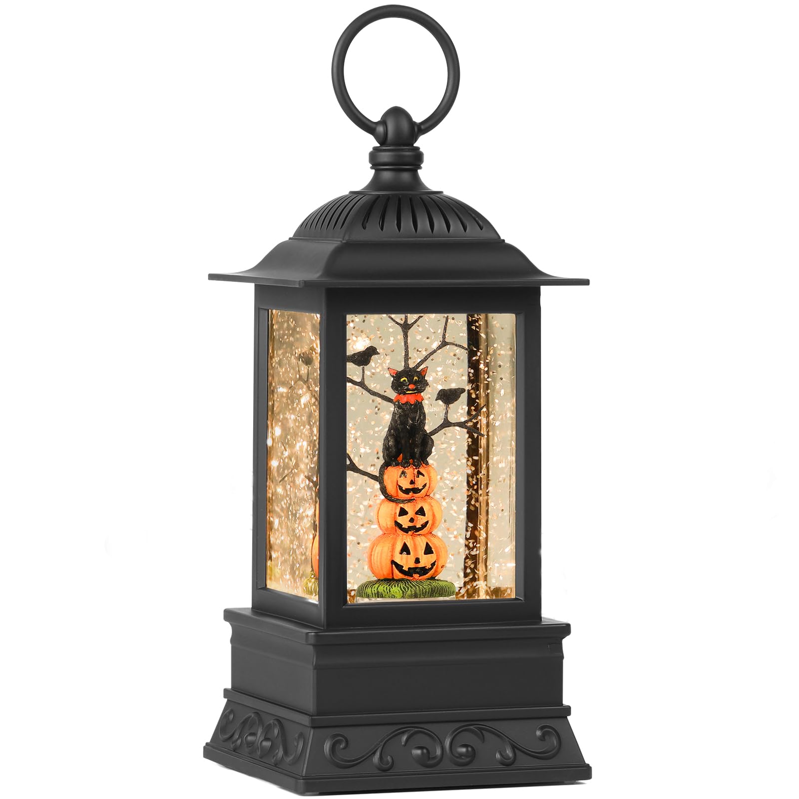10'' Halloween Snow Globe, Lighted Musical Glitter Globe, Battery Operated or USB Powered Glitter Lantern for Spooky Halloween Festival Party Home Table Decorations (Pumpkin and Black Cat Combo)