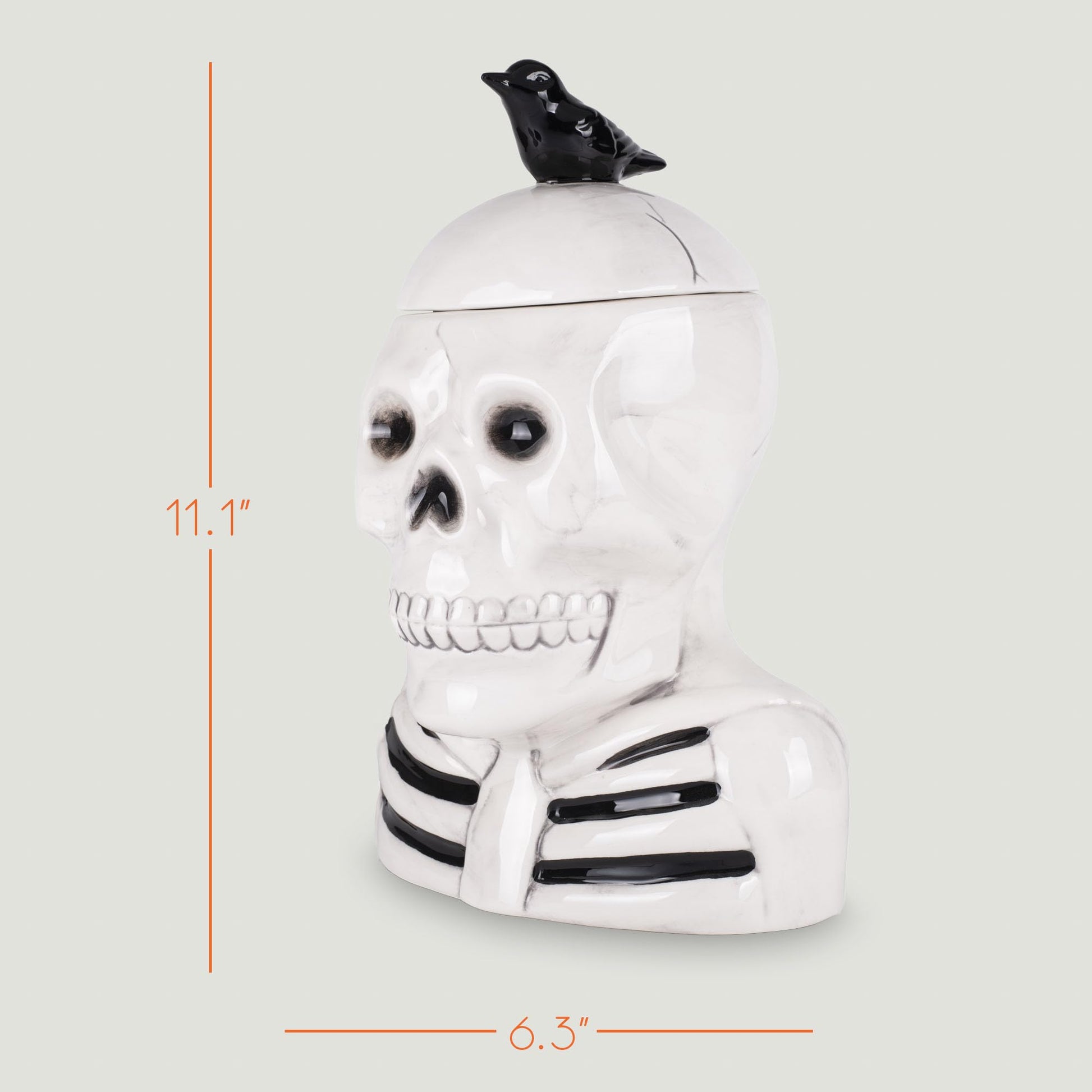 • FUN, WHIMSICAL DESIGN - Features a scary skeleton with a crow resting on top of his skull. Perfect for adding that spooky element to your kitchen counter top or living room shelf.