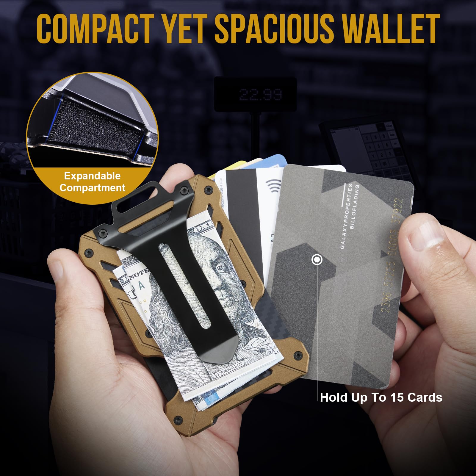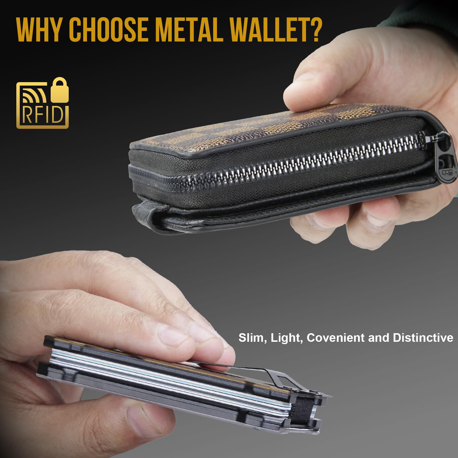 • Compact Yet Spacious Men Wallet:Small slim wallet, but it boasts an impressive capacity to hold up to 15 cards , effortlessly accommodating all your essentials. What's more, the back of the metal wallet features a resilient elastic strap money clip designed to securely store up to 9 bills. Say goodbye to bulky wallets as our compact and lightweight metal wallet offers the perfect solution for on-the-go convenience.