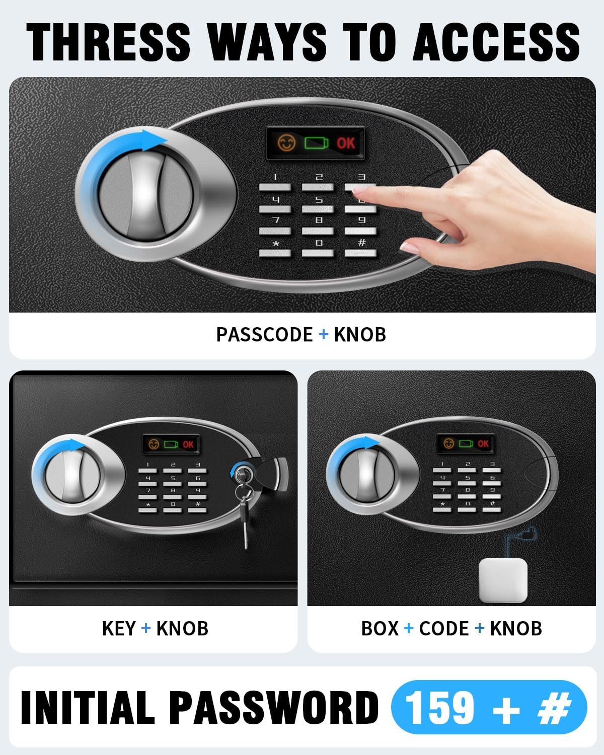 • 【ANTI-THEFT ALARM】: Our home safe comes with a dual alarm system to prevent password guessing and effectively deter unauthorized access. Enter the wrong password 3 times in a row will activate the alarm system and the safe will lock for 20 seconds