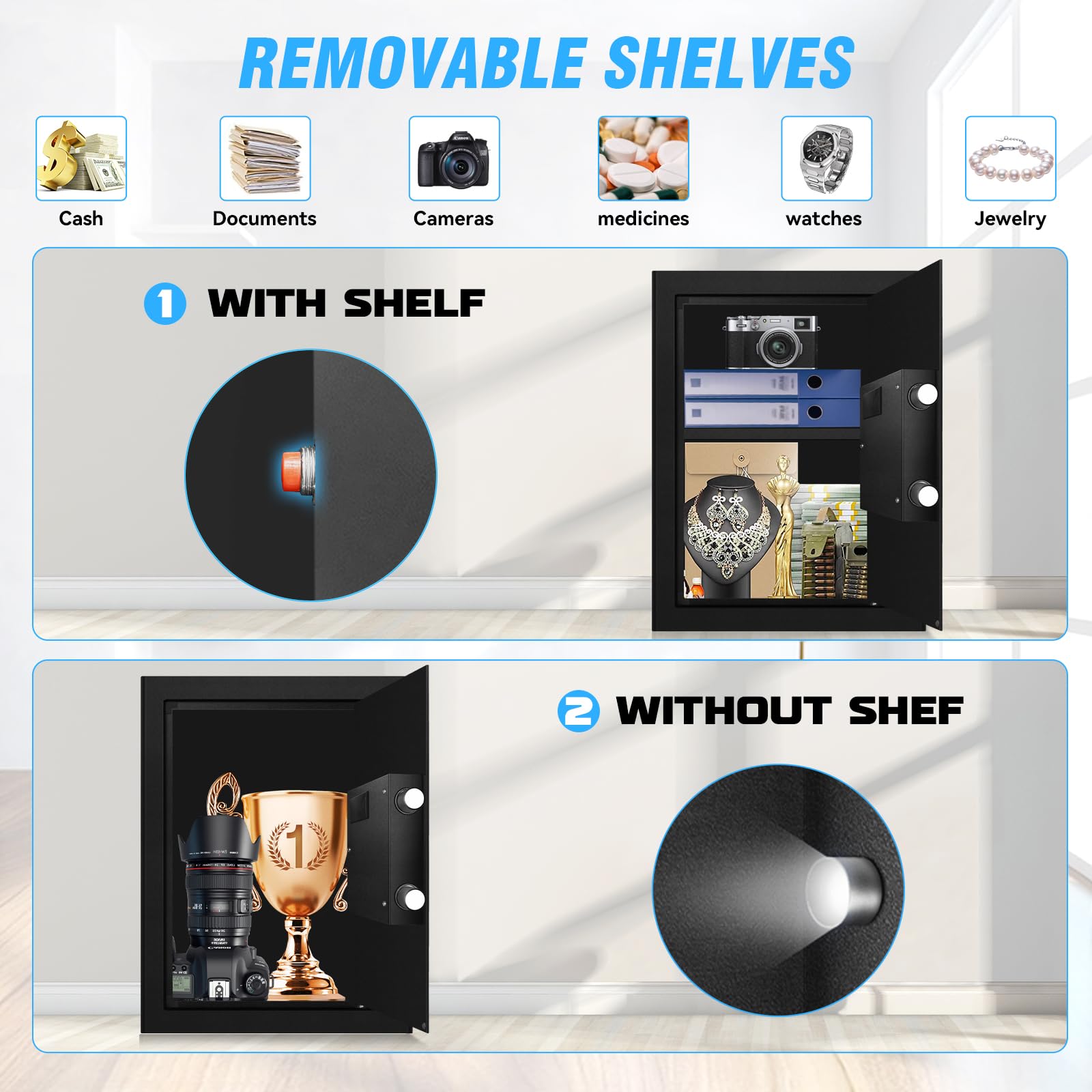 • 【REMOVABLE SHELVES】: This fire safety boxes for home, featuring removable shelves, can accommodate a wide range of items, including documents, cash, jewelry, and electronics, thus enhancing its practicality. Moreover, the removable shelves simplify the cleaning of the safe's interior, as they can be removed and cleaned individually. This ensures improved hygiene and better care for the stored items