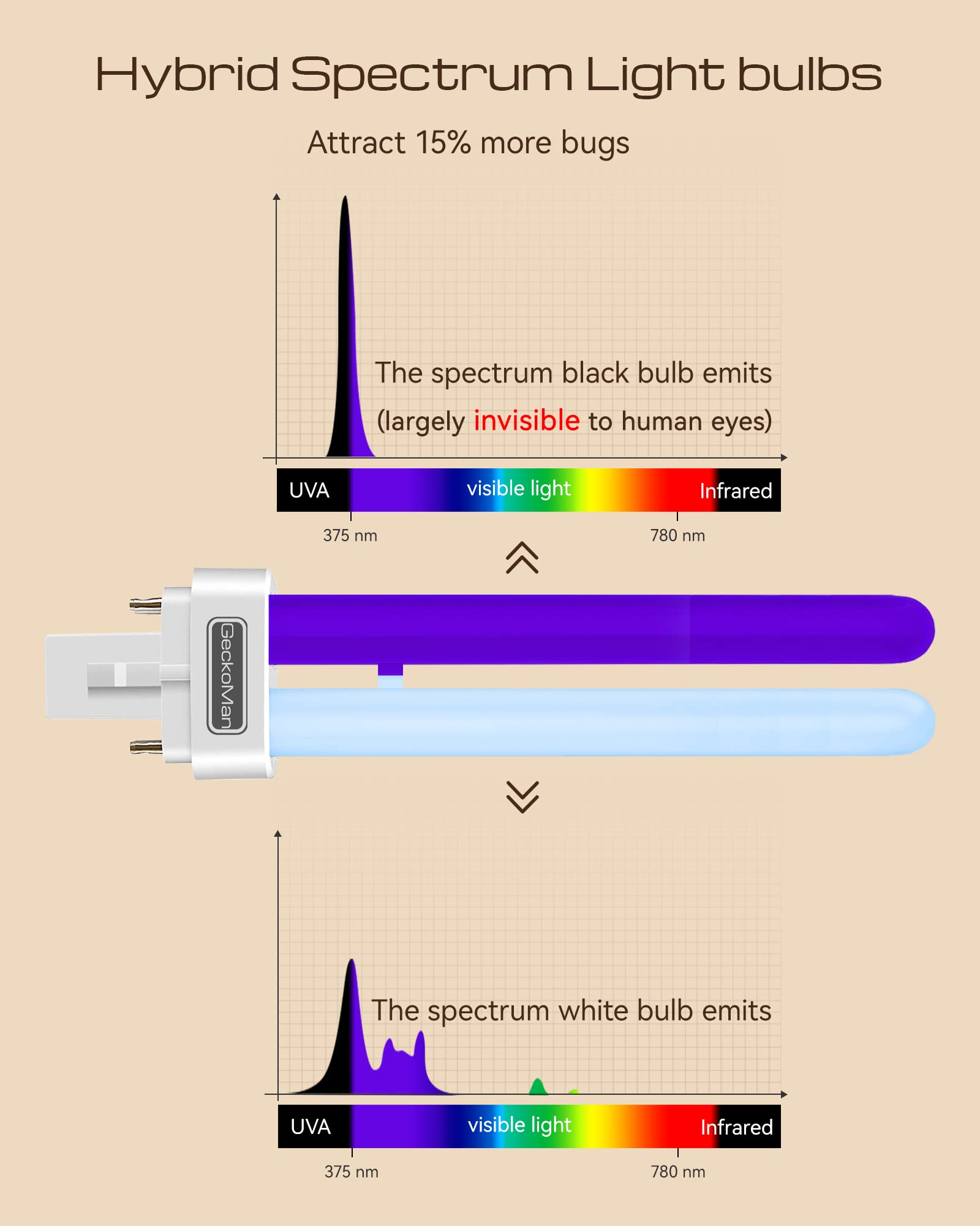 • 【🌈 Hybrid Spectrum】15W hybrid regular UV and black UV dual bulbs emit a broader light spectrum, which is more effective in attracting a variety of pests, including flies, fruit flies, mosquitoes, gnats, and moths, etc.
