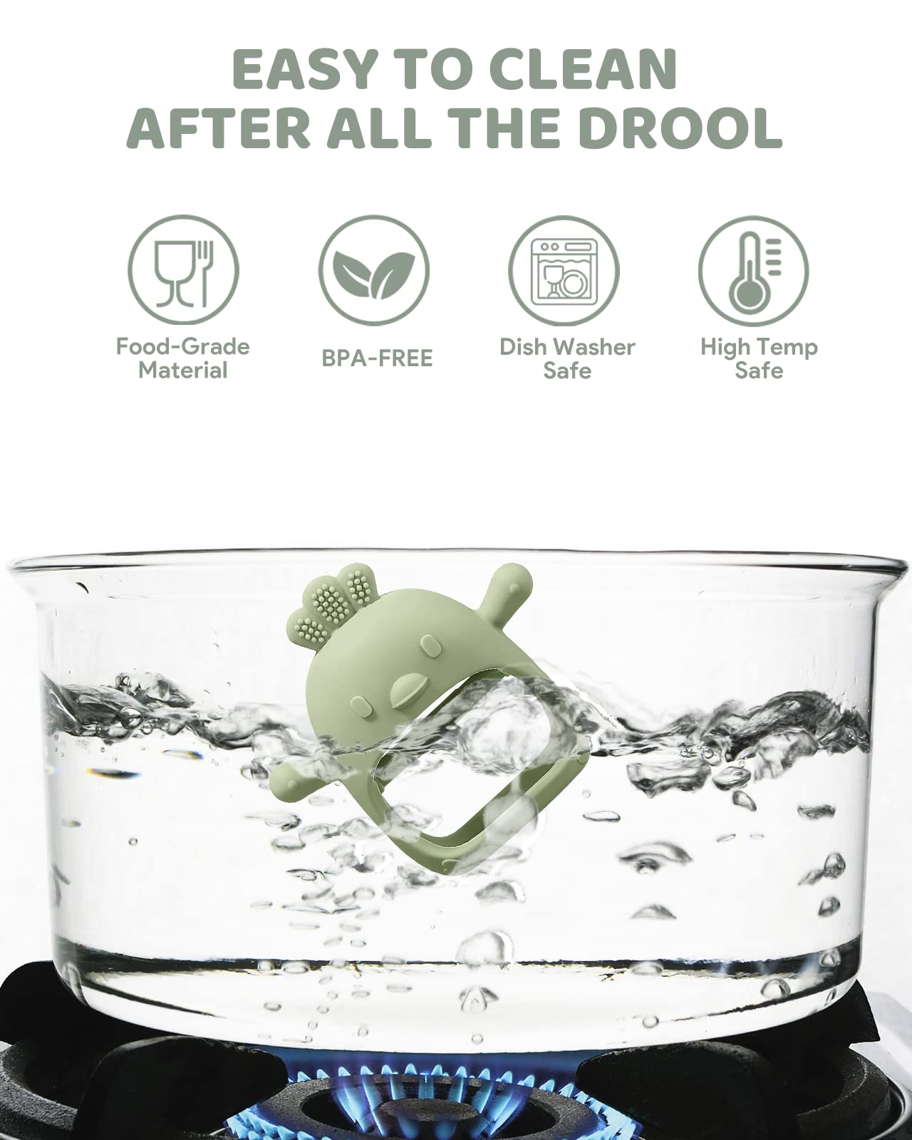 • 【Soothe Baby Sore Gums】If your baby is showing symptoms like heavy drooling and and irritability, they may be getting their first tooth. Teething babies have the urge to put pressure on the gums where the tooth is emerging from. Chewing on a teething toy can help soothe sore gums.