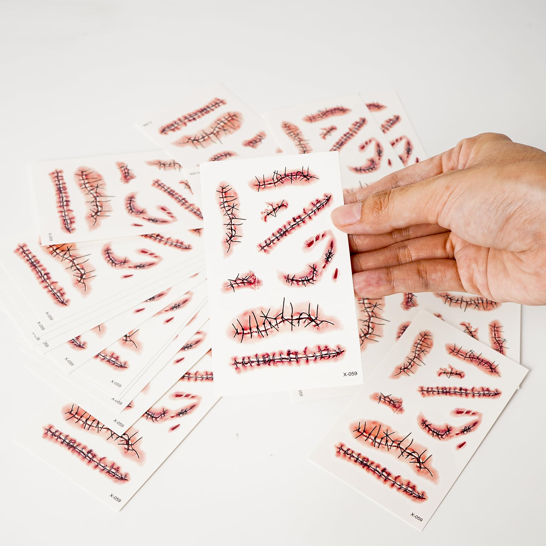 20 Sheets Halloween Zombie Temporary Tattoos - NEDEQI Chucky Scar Fake Blood Tattoos Waterproof Realistic Stitches Wound Temp Tattoo for Chucky Cosume Prank Makeup Cosplay Kids Men Women Adults