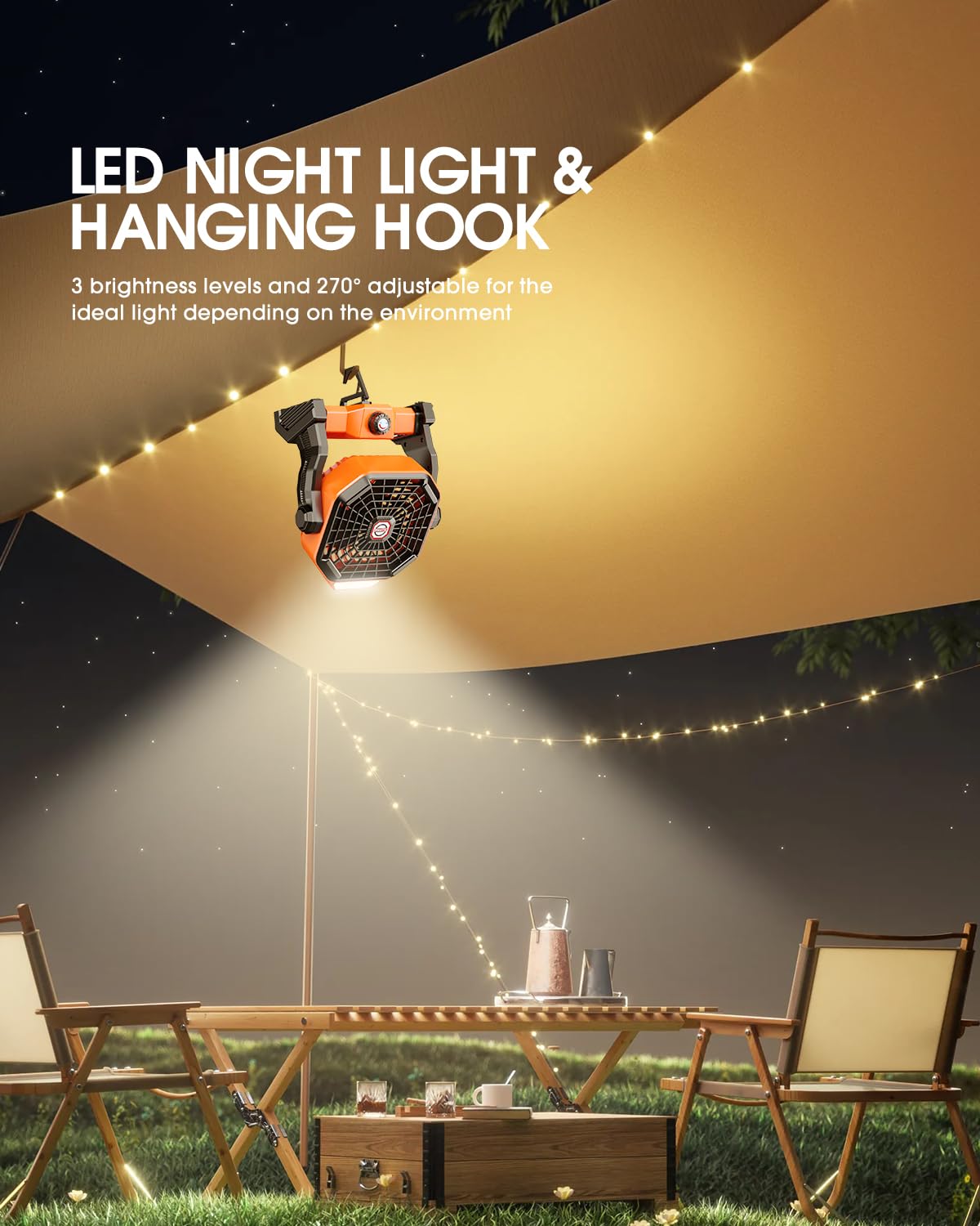 • 【Super Bright LED Camping Lantern】- The battery operated fan has 3 brightness settings. Provides the desirable light source for nighttime outdoor activities, like barbecue, picnic, hiking, fishing, etc. In addition, the tent light fan has a hook design that can be easily hung on the top of the tent, saving space.
