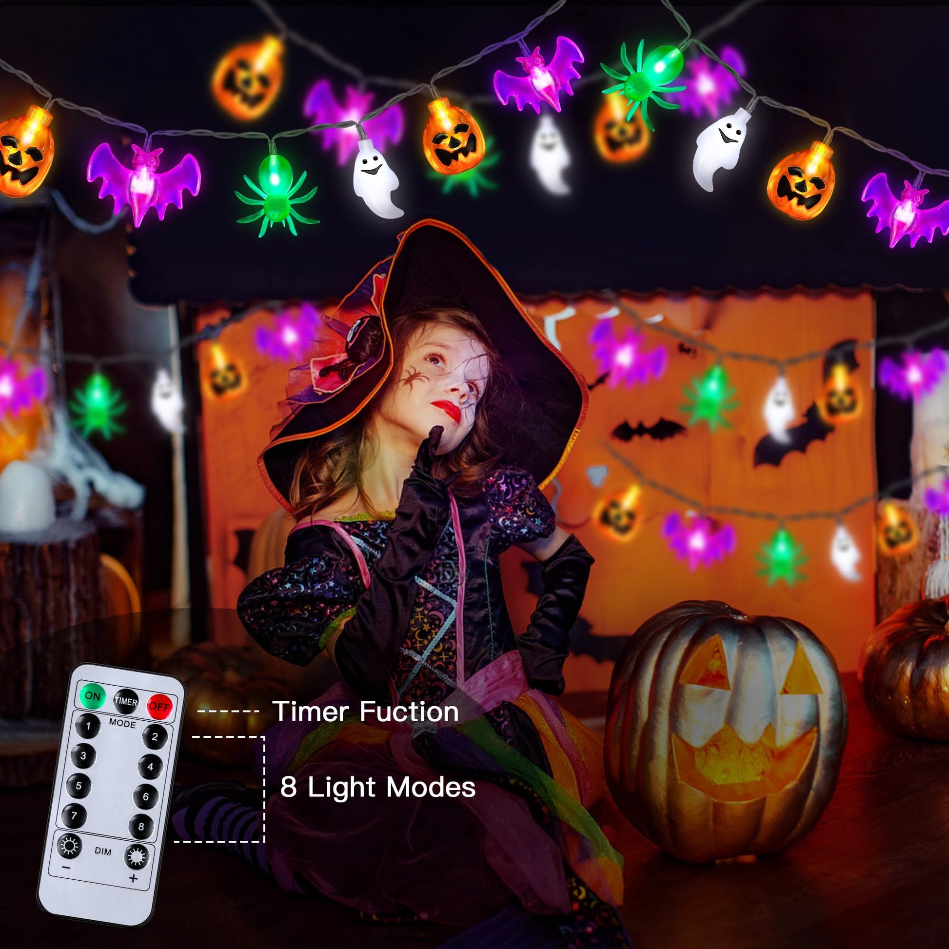 • 8 Lighting Modes & Timer Function – Choose from 8 fun light modes including combination, waves, flash, sequential, slow glow, slow fade, twinkle and steady on. With the remote control, easily set a timer for 6 hours on / 18 hours off daily – perfect for hands-free Halloween fun!
