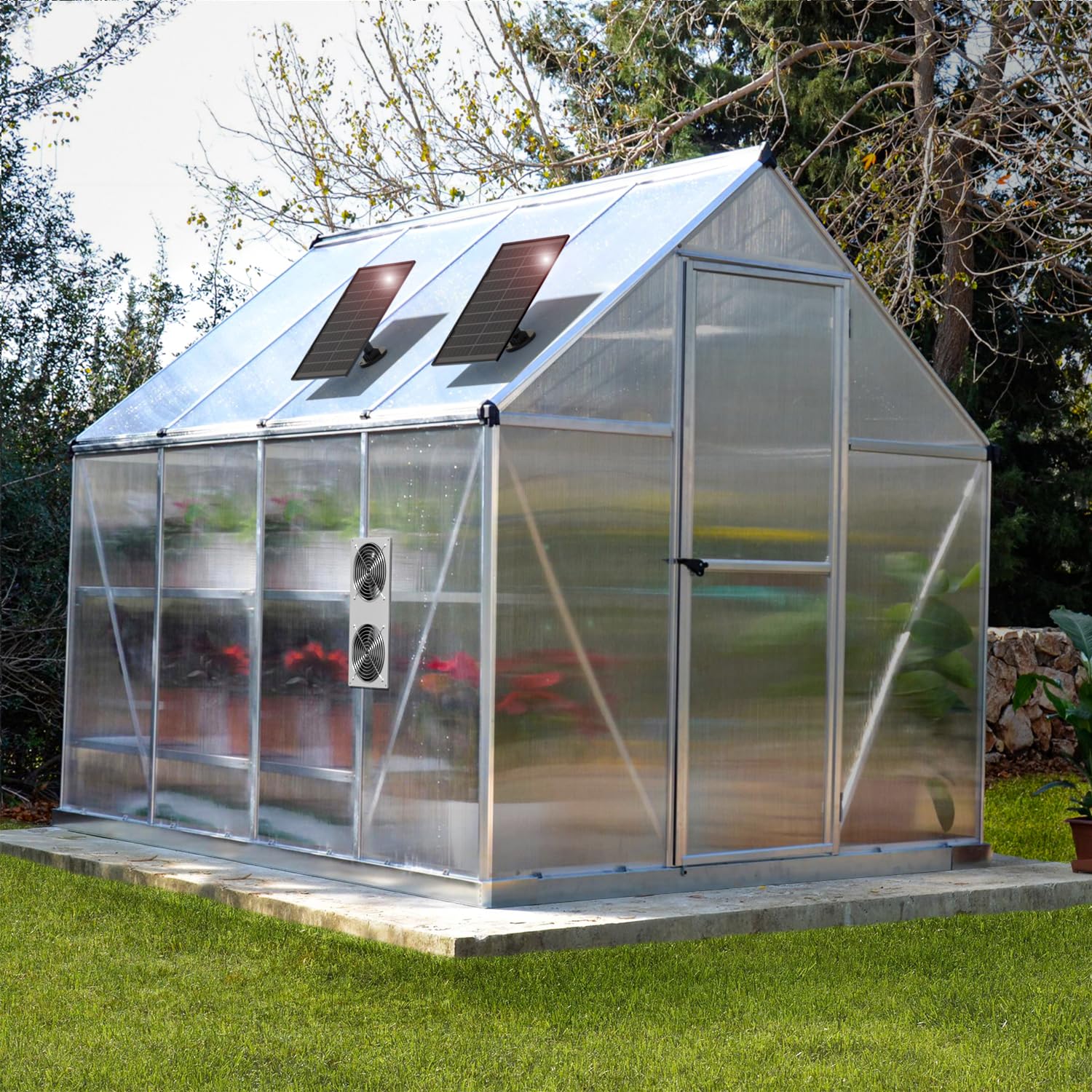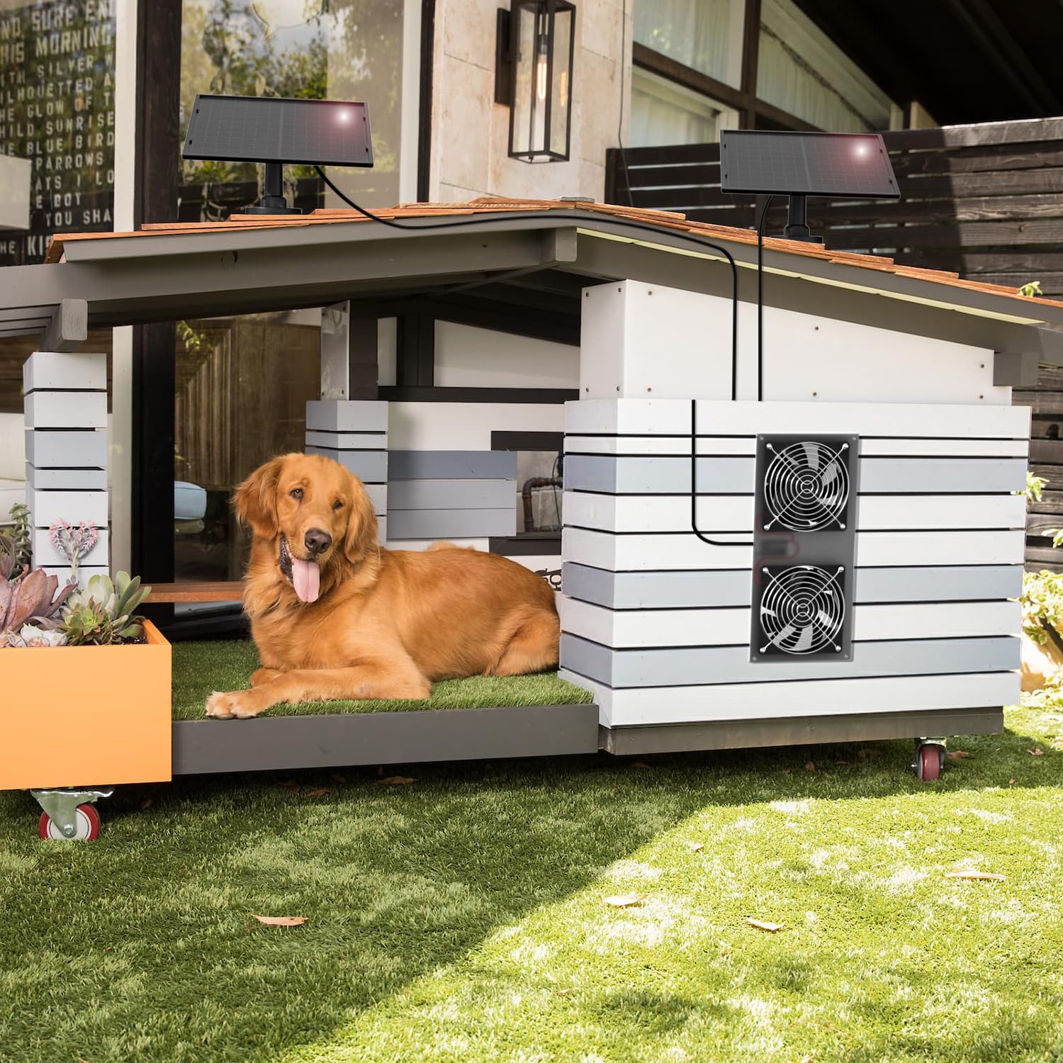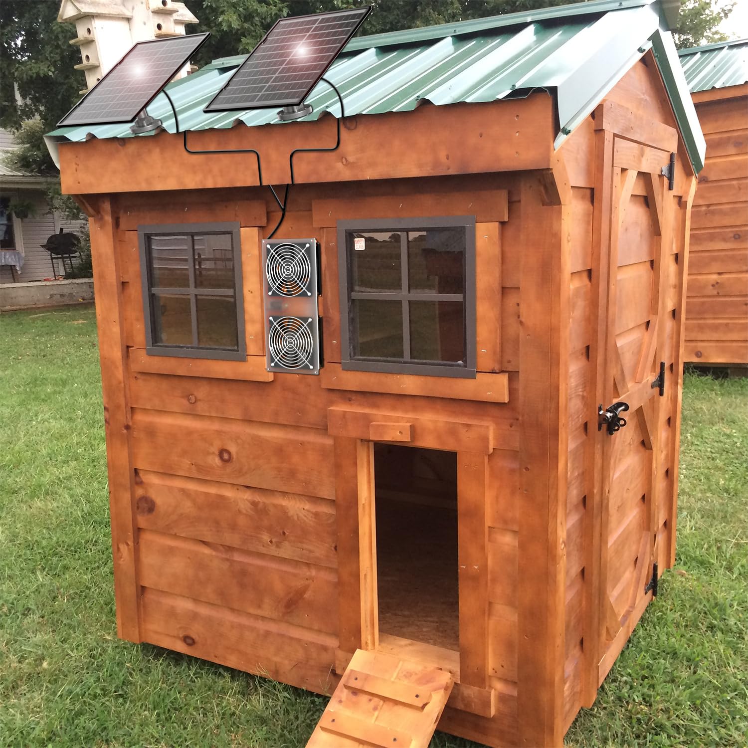 • ✔ COOL AND CLEAN: This is an excellent solution for Small Chicken Coops, Greenhouses, Sheds,Pet houses, Window Exhaust in the hot summer .The 20W Solar Panel Dual Fan Kit can push the heat air out and push the cool air in,which effectively reduces the indoor temperature and keeps the air fresh.