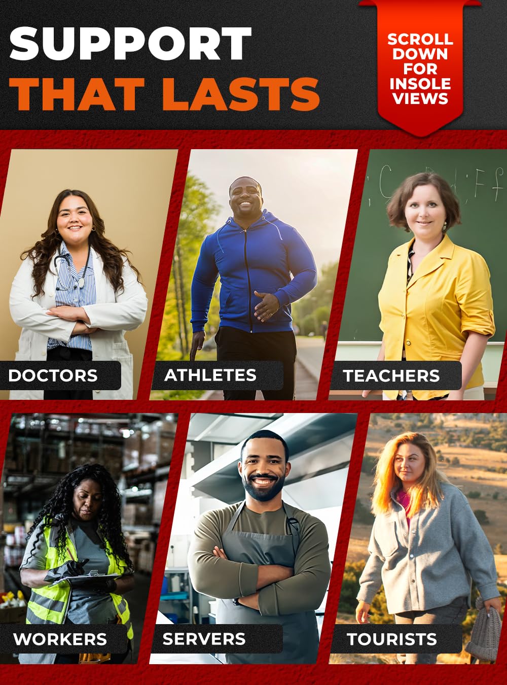 • Designed for comfort: Insoles alleviate joint and spine stress, reduce foot pressure, and provide comfort for those with back pain or long work hours