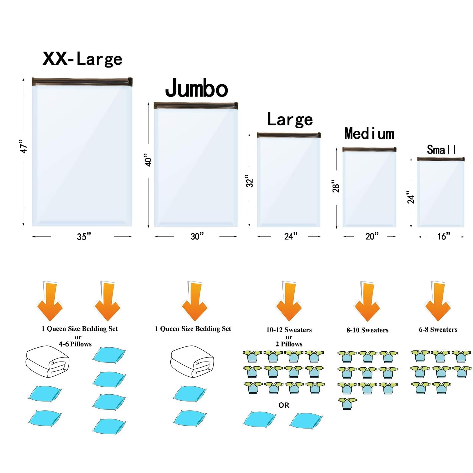 • [Comprehensive 24-Bag Variety] This versatile set includes 5 Jumbo, 5 Large, 5 Medium, 5 Small, and 4 Travel roll up bags, covering all your storage needs. Whether it’s for blanket storage or securing seasonal attire, our assortment ensures everything from bulky outerwear to delicate garments is protected and organized, proving indispensable for both home use and as travel vacuum bags with pump.