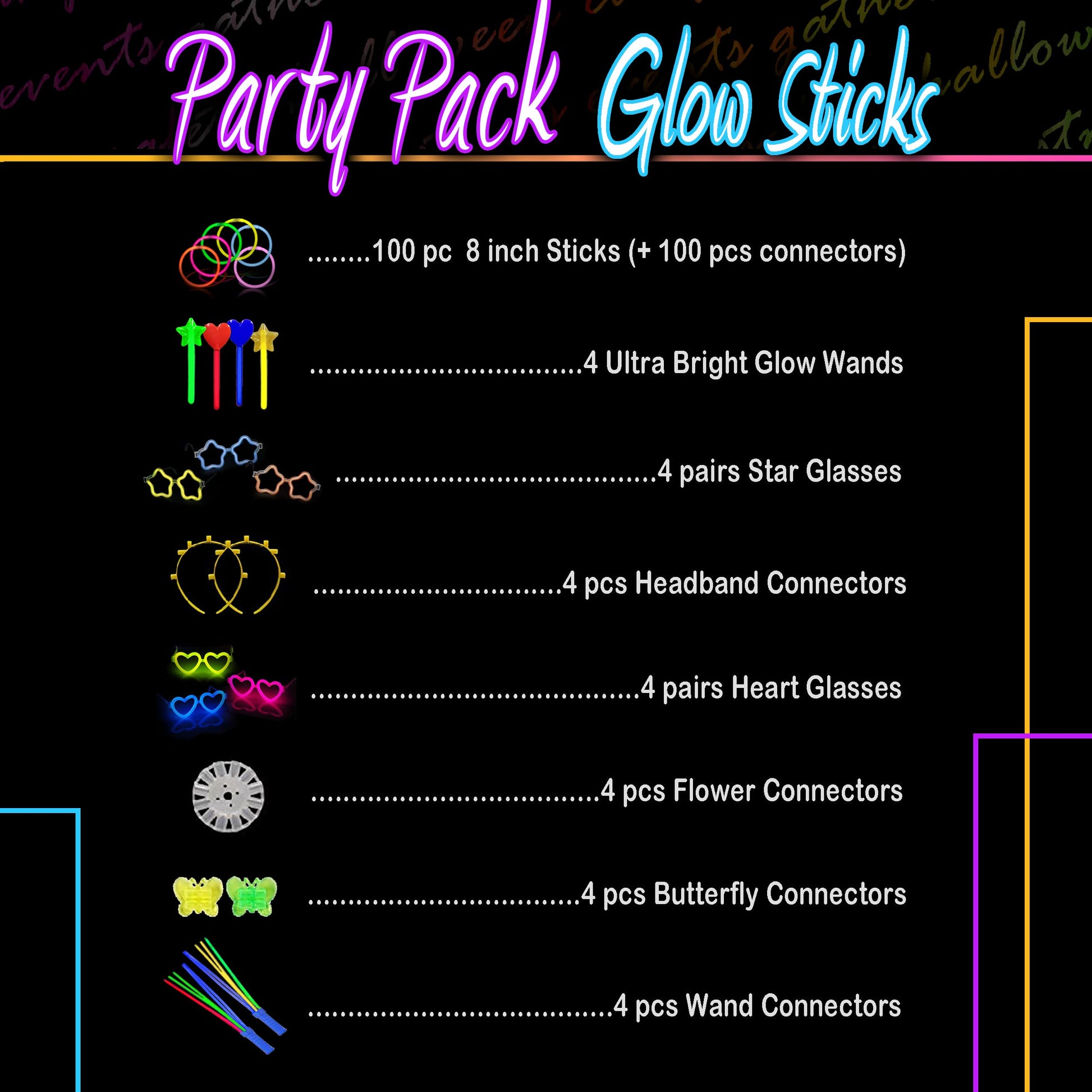 • GREAT VALUE GLOWING PARTY PACK: includes100 Pc 8-inch sticks (100 pcs connectors), 10 pcs ultra-bright glow sticks, 8 pairs glasses connectors, 6pcs headband connectors, 8 pcs triple connectors, 4 pcs flower connectors and 4 pcs butterfly connectors. Perfect for parties and decoration!