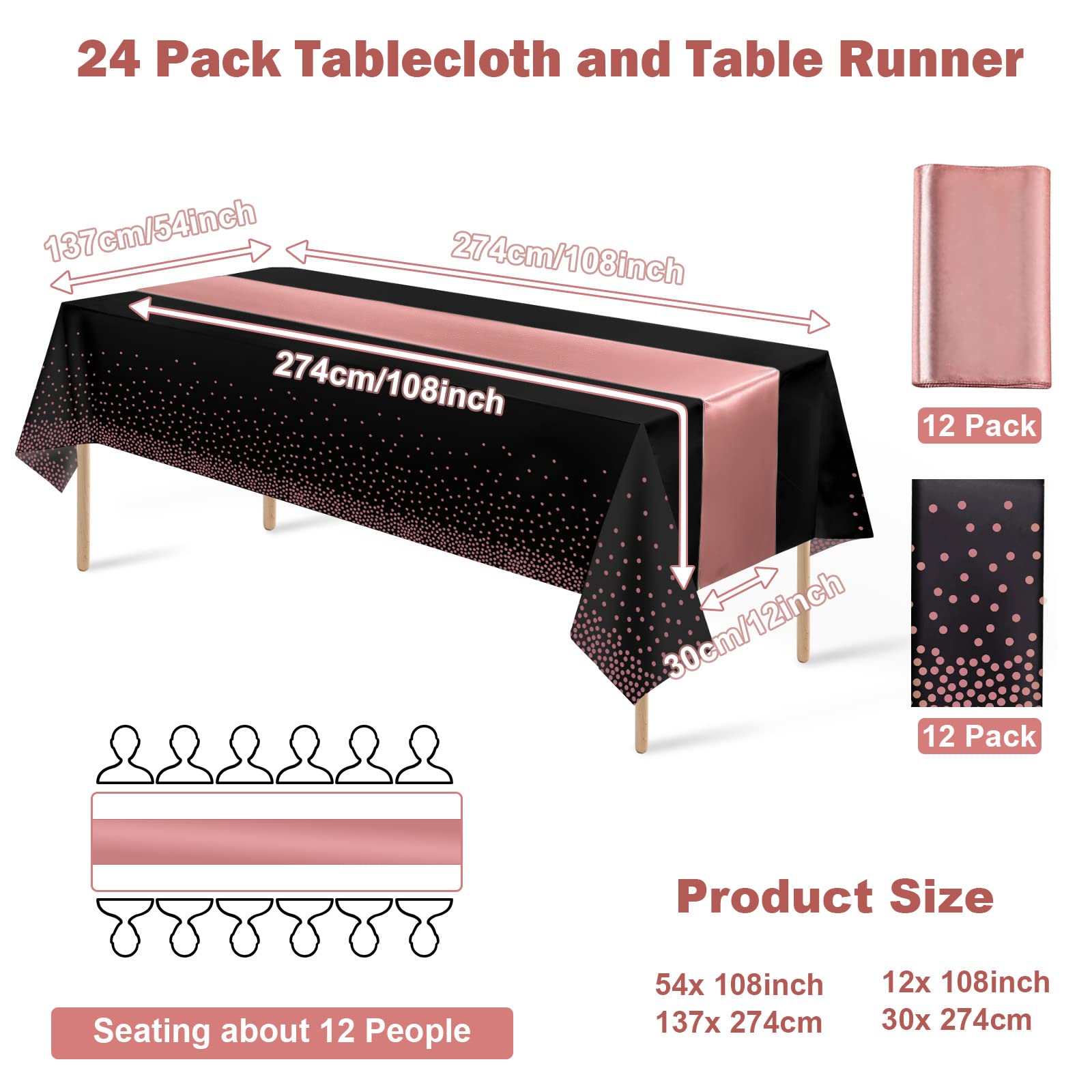 24Pack Disposable Plastic Tablecloth and Satin Table Runner Black and Rose Gold Dot Tablecloth Rose Gold Satin Table Runner for Wedding Birthday Baby Shower Anniversary Christmas New Year Party Supply