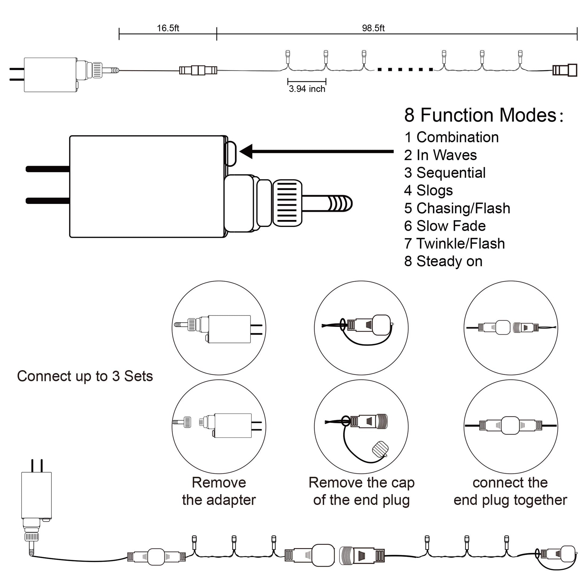 • 30V low voltage black wire string lights: Keep at a low temperature state after lighting up for hours, ensure and maximize the safety. Directly plug in and unplug it for power on and off. US standard outlet, voltage 110V. Adapter to the first LED light: 16.5ft. Total length(lights string and leading line): 115ft.