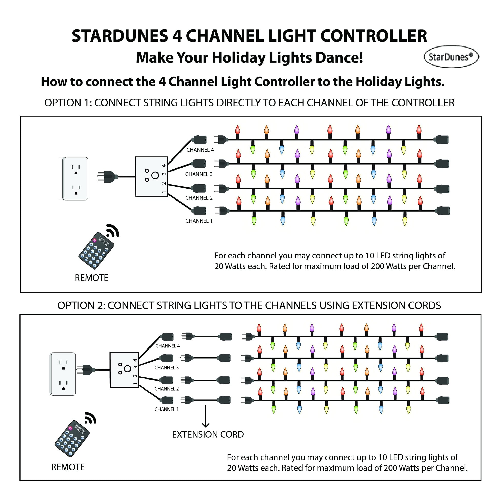 • Easy to use – just plug your holiday lights to the Controller’s 4 channels. The channels are numbered 1 to 4. To get chasing effects the decorations should be connected to the Controller in the sequential order 1 to 4.