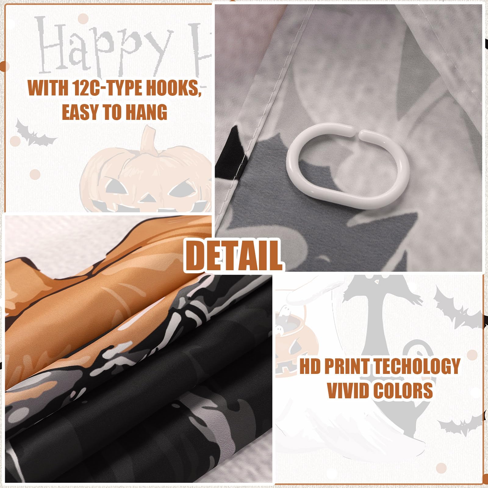 • Delicate Design: our Halloween shower curtain sets with rugs feature horrible theme, with ghost, pumpkin, bat and black cat design, printed with the words of [Happy Halloween], the overall color palette makes you feel good about using them