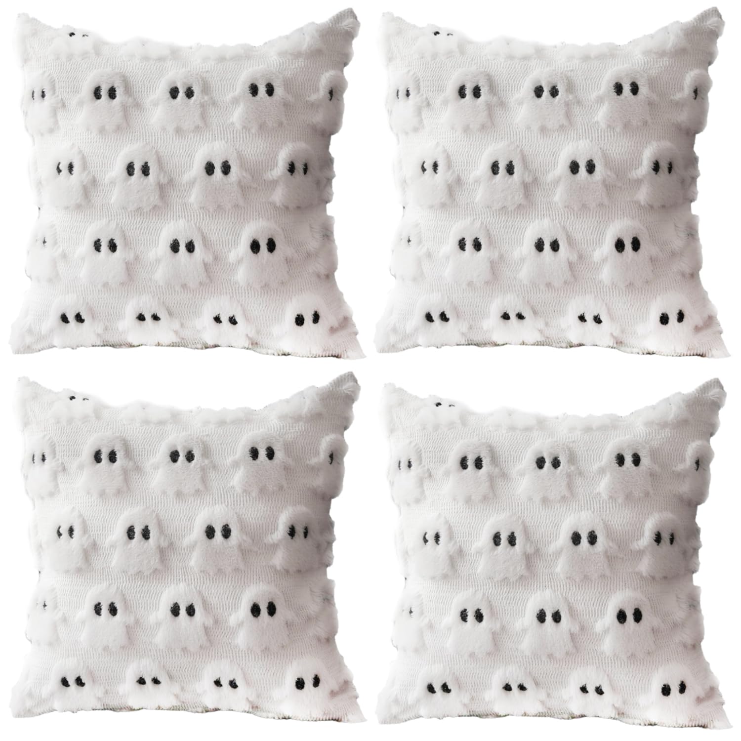 4 Pcs Halloween Throw Pillow Covers 18x18, Soft Faux Fur Pillow Cases Decorations, Fluffy Plush Accent Couch Cushion Case for Halloween Chair Sofa Bedroom Living Room Home Decor(Ghost B)