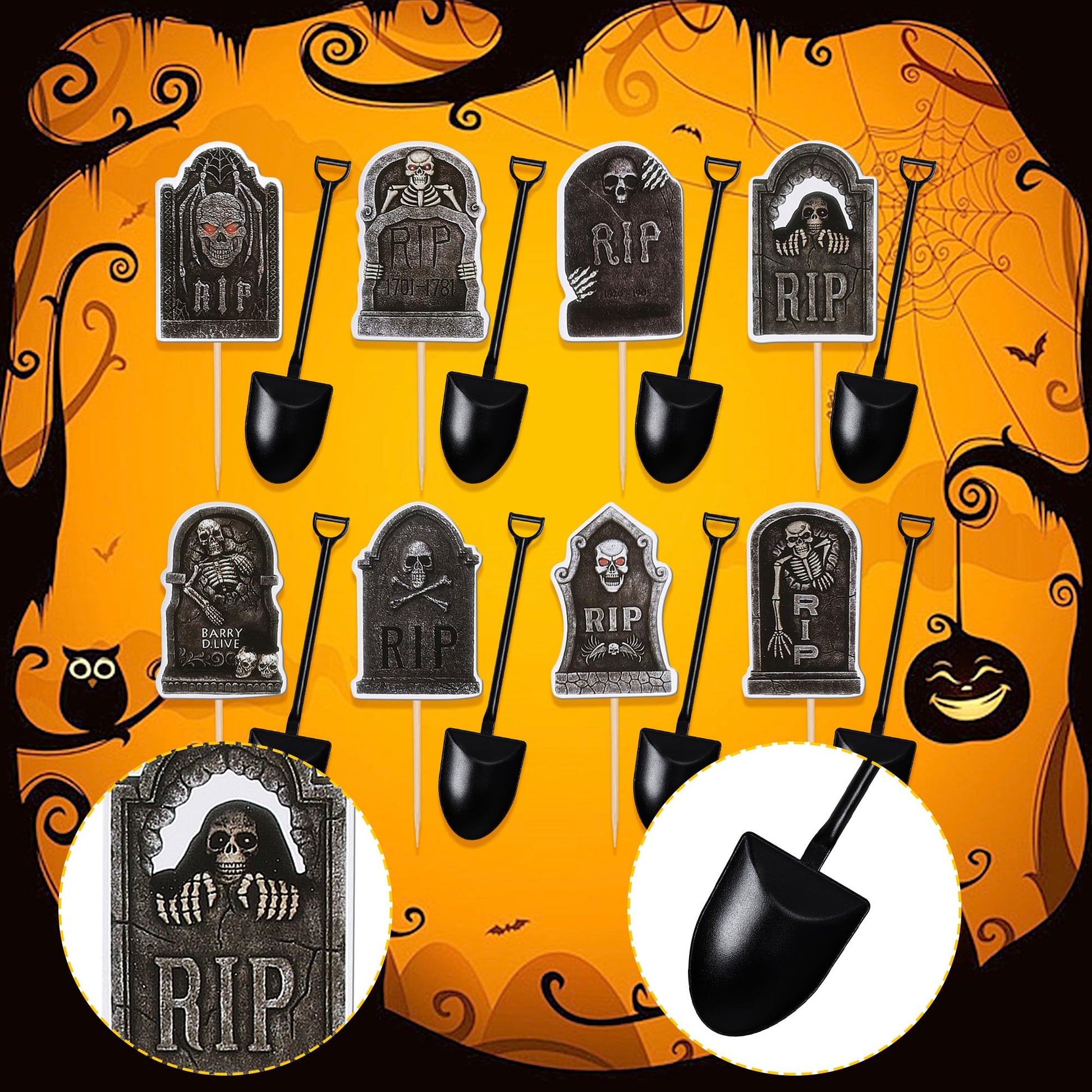 Details: 48 PCS Halloween Cupcake Toppers Tombstone Cupcake Picks Novelty Mini Shovel Spoons Horrible Graveyard Skeleton Cupcake Decorations for Halloween Theme Birthday Party Cake Decorations Supplies