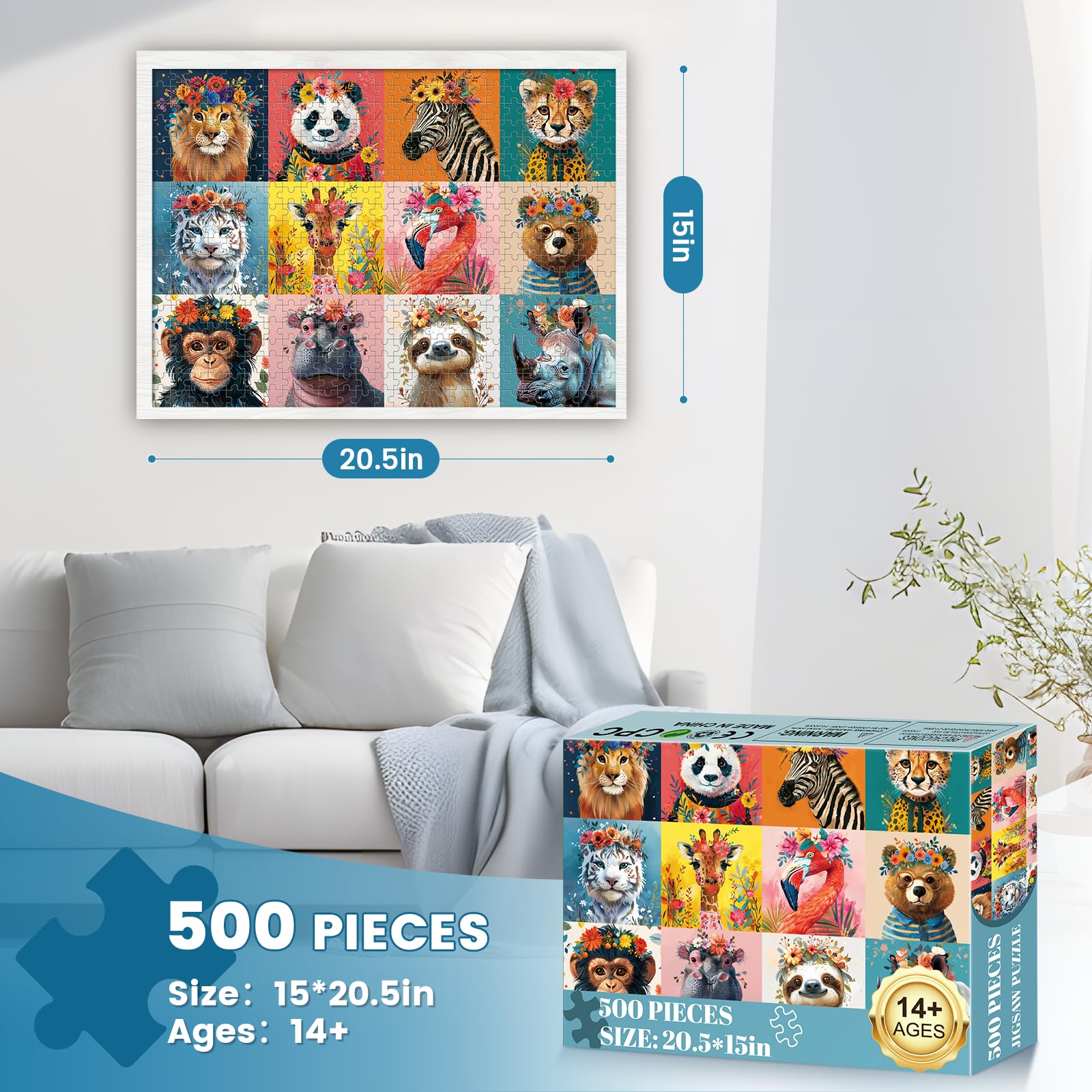• Beautiful Wild Animals Puzzles 500 Piece--- Enjoy the playful charm of our animal puzzle. This 500 piece puzzle features a 12-grid layout, each square showcasing a cute portrait. Perfect for cute animal lovers and puzzle fans, it's sure to bring a smile to your face!