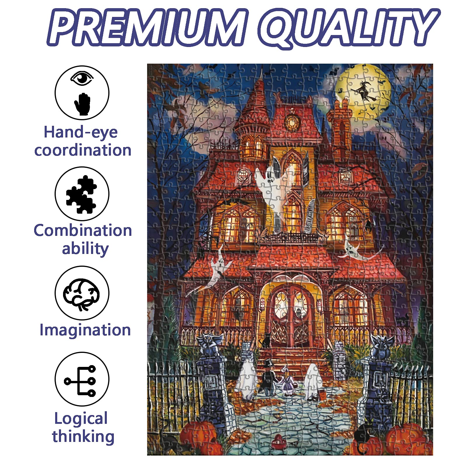 • 【Puzzles Design】Halloween puzzles front side laminated and 1-500 number distinction printed on the back, with precise cutting effects, ensure tight and clear images.If you want a more challenging experience, don’t sort please.finished size:14'' * 20''.