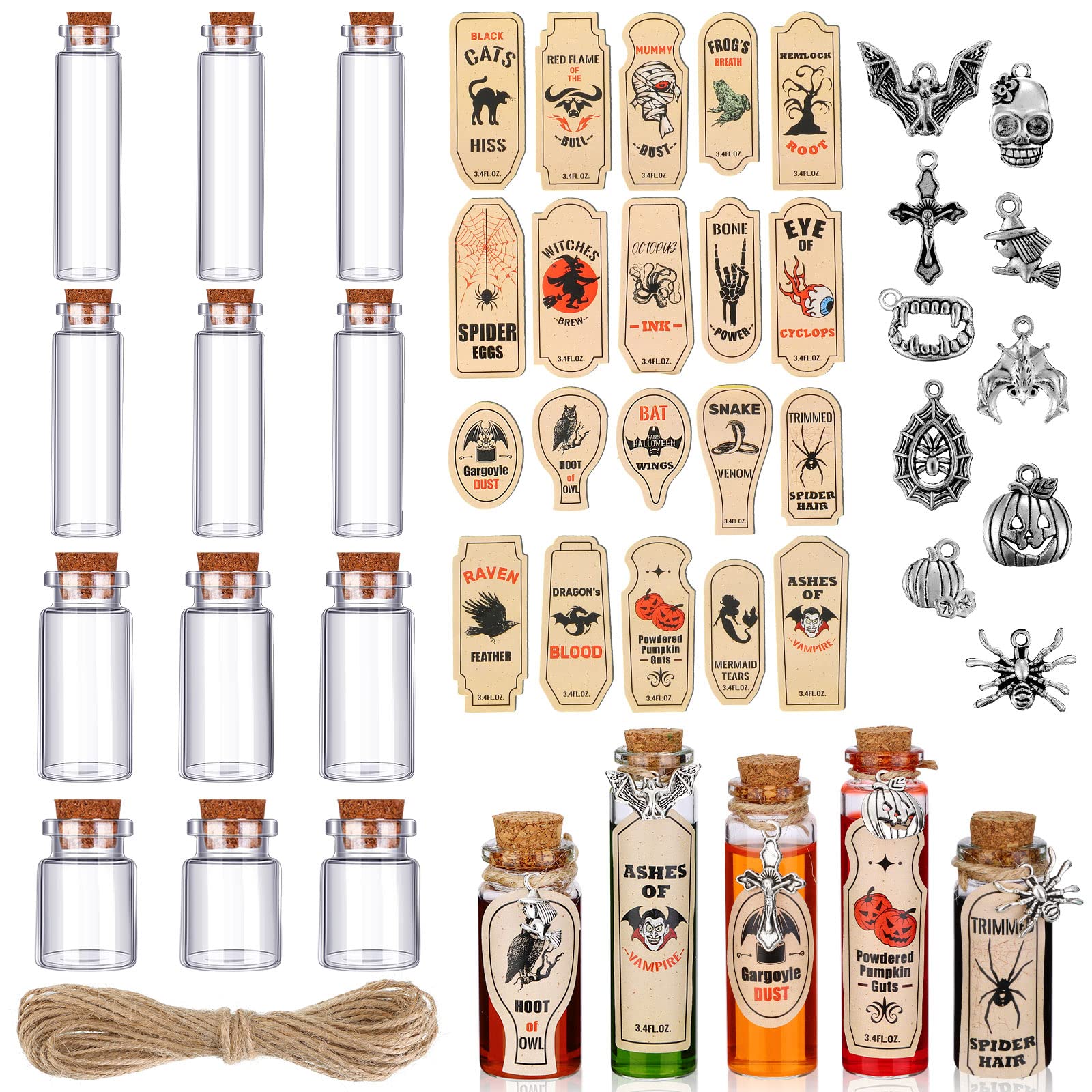 53 Pcs Halloween Mini Potion Bottles Set Including 12 Decorative Glass Bottles with Cork Stoppers 20 Creepy Apothecary Bottle Labels Stickers 20 Charms Pendants 1 String (5/10/15/20 ML,Classic)