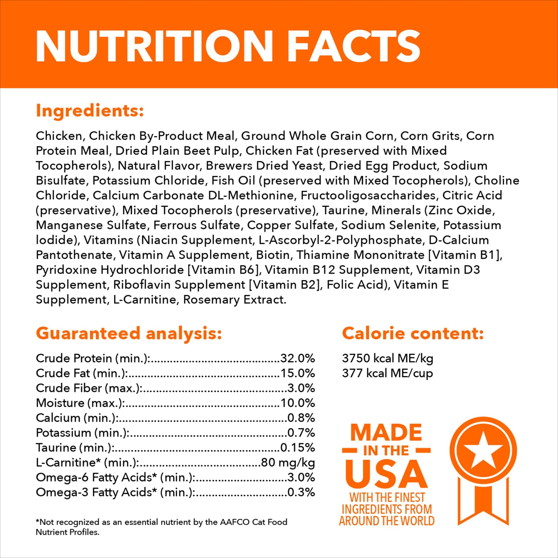 Details: Mealtime matters. IAMS Proactive Health Healthy Adult Cat Food with Chicken is an everyday meal that’s 100% complete and balanced to help adult cats stay on the path to health. This wholesome, tasty, cat food recipe is made with real salmon and healthy ingredients that provide essential nutrients for your adult cat. These essential nutrients, such as potassium and calcium, can help nourish a healthy heart for your feline friend when fed IAMS dry cat food. As an added benefit, Omega 6 and 3 fatty acids in this adult cat food help nourish your cat’s skin, and promote a glossy, vibrant coat. Help keep your cat healthy, happy, and playful for life with tailored nutrition in IAMS cat food.