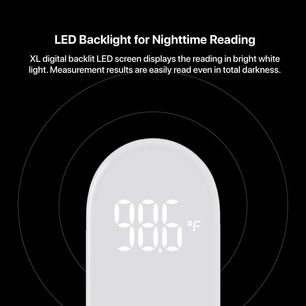 • Simple, Fast, Clear, And Quiet: With an intuitive single-button control design, the thermometer reads and shows the temperature in just one second on its easy-to-read, extra-large LED display, even in total darkness. When the temperature is read, the device gives a gentle vibration notification to the holding hand—no beeps or buzzes.