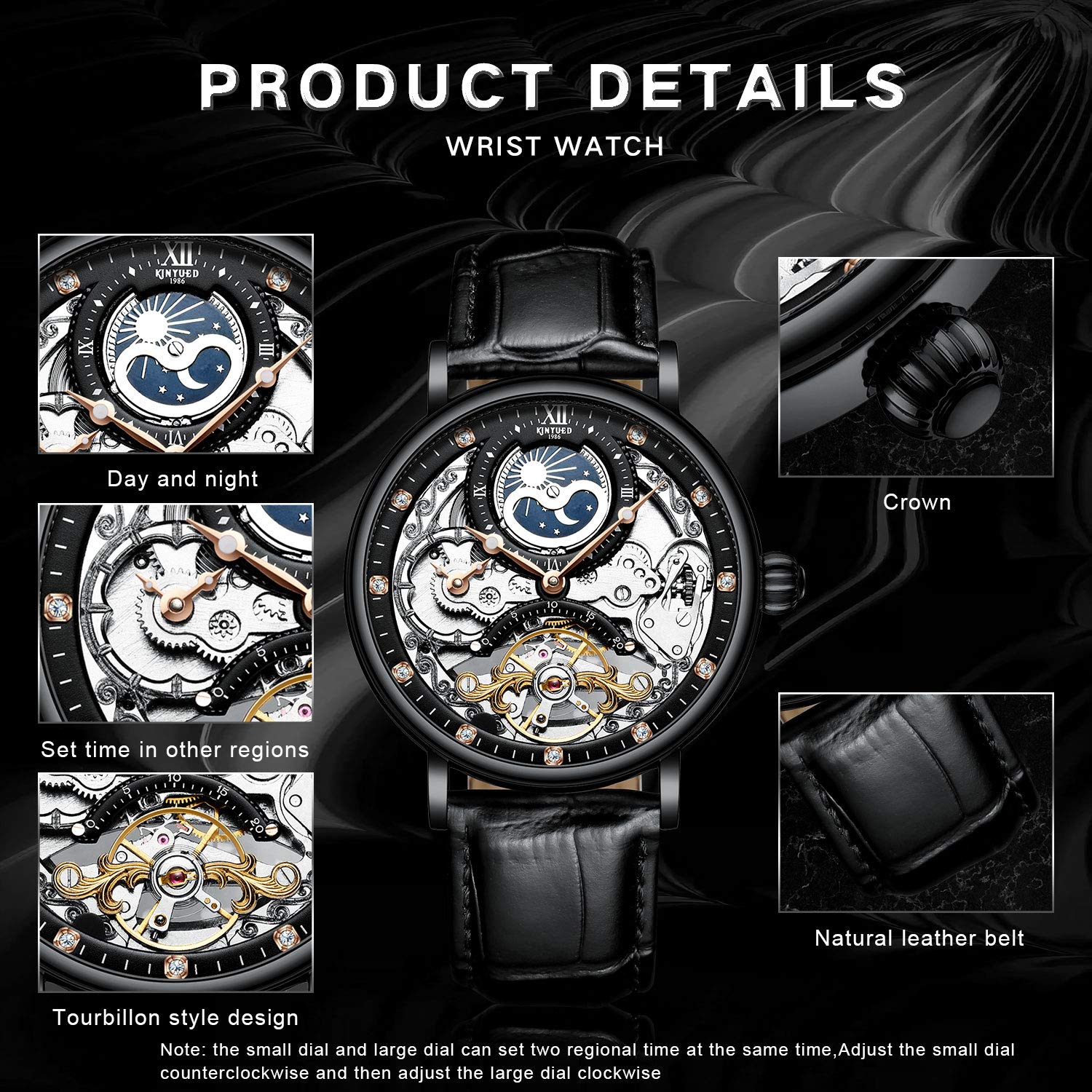 • SMALL BUDY, BUT VERSATILE:uality brand original automatic tourbillon style relojes de hombre(watch); without a battery; calendar,waterproof, moon phase function.