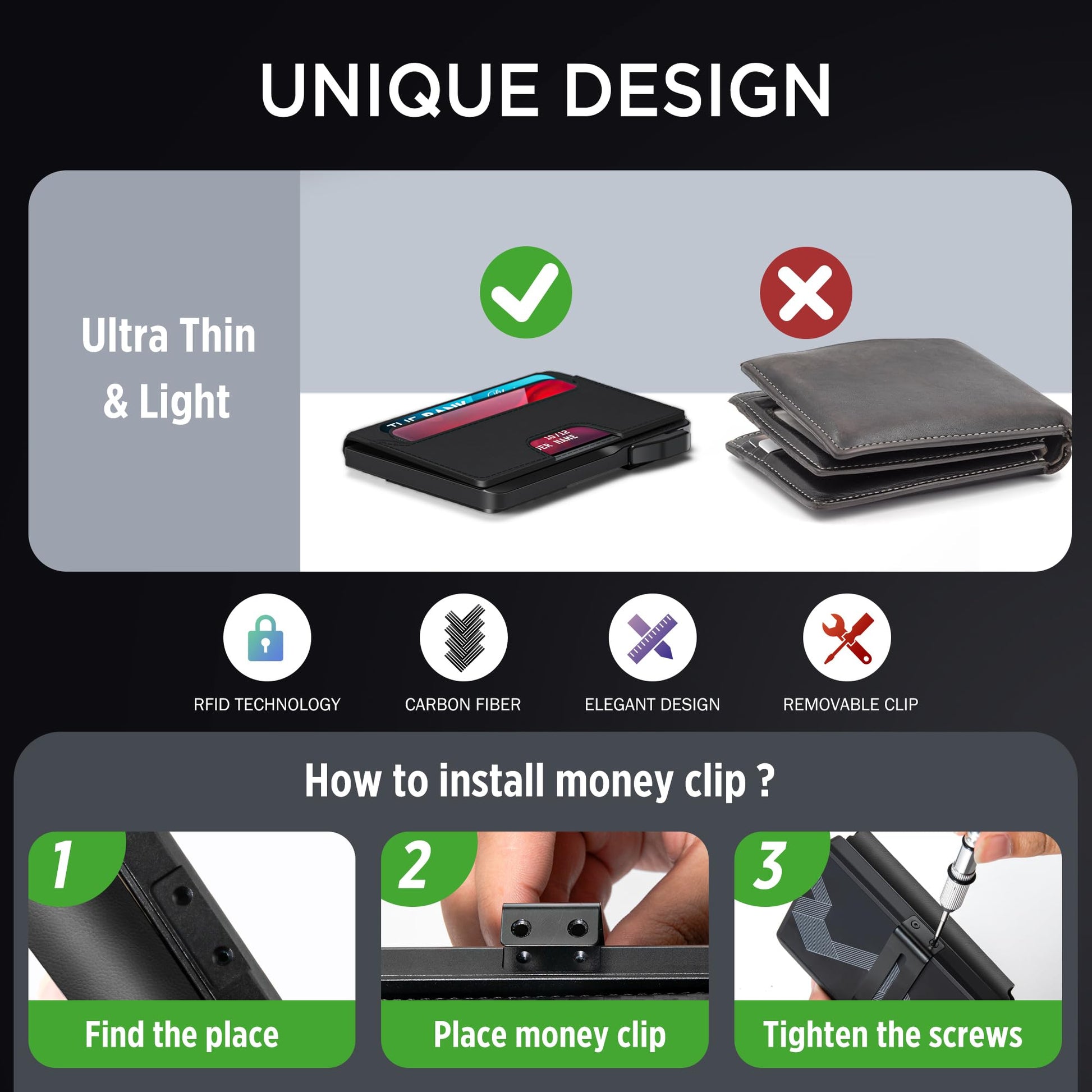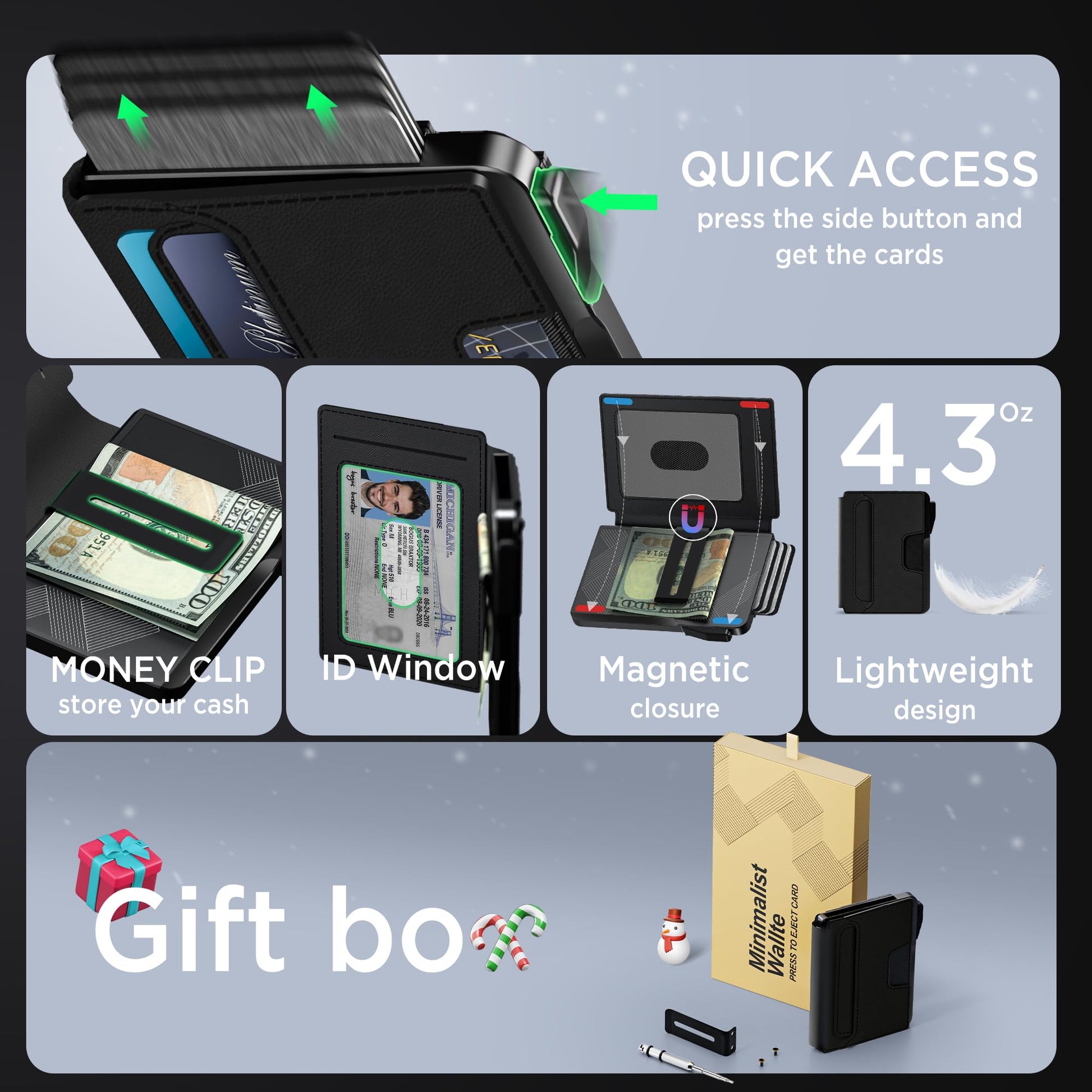 • 【Excellent Gift】With its modern aesthetic look, this compact wallet is suitable for men, women, and teens. It makes an excellent gift for Dad,Boyfriend,Friend, or Husband.Whether it's Father's Day, Valentine's Day, Christmas, or a birthday, this smart wallet is sure to bring joy to any man.