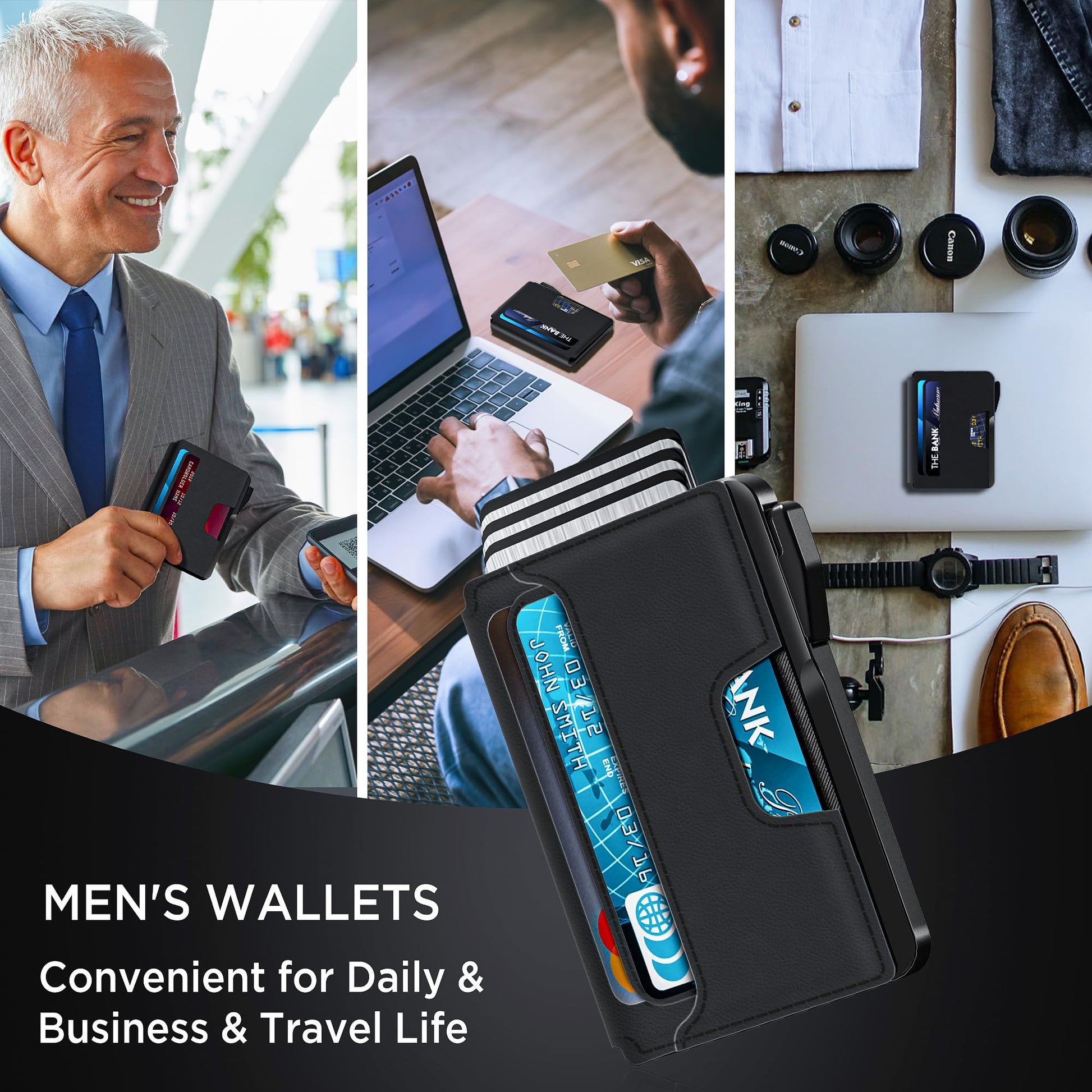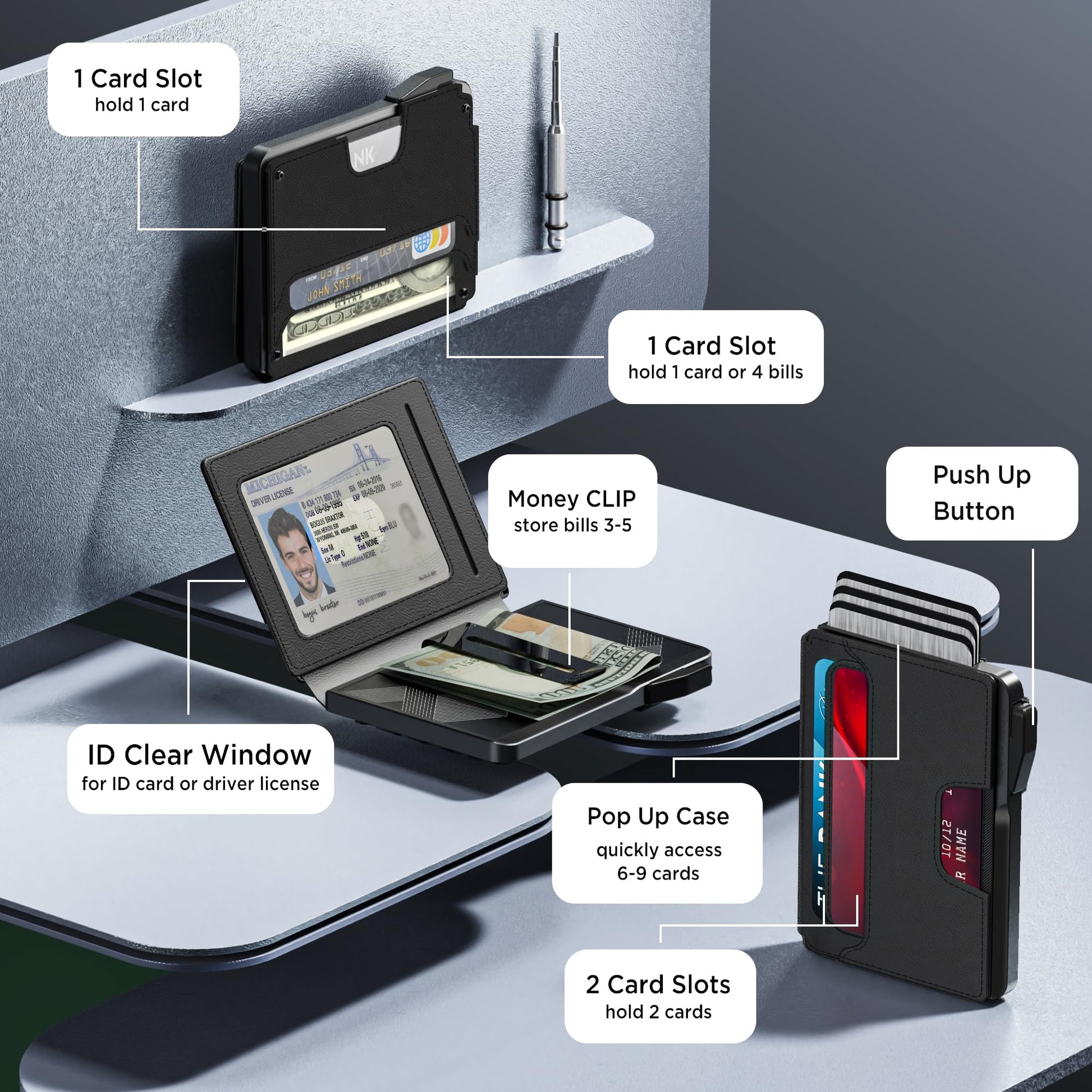 • 【Quick Access】Fumbling through your old wallet should be a thing of the past. With a simple pop-up button on the side the metal wallet that can be operated with a single hand, you'll effortlessly access your cards, saving you time and frustration.