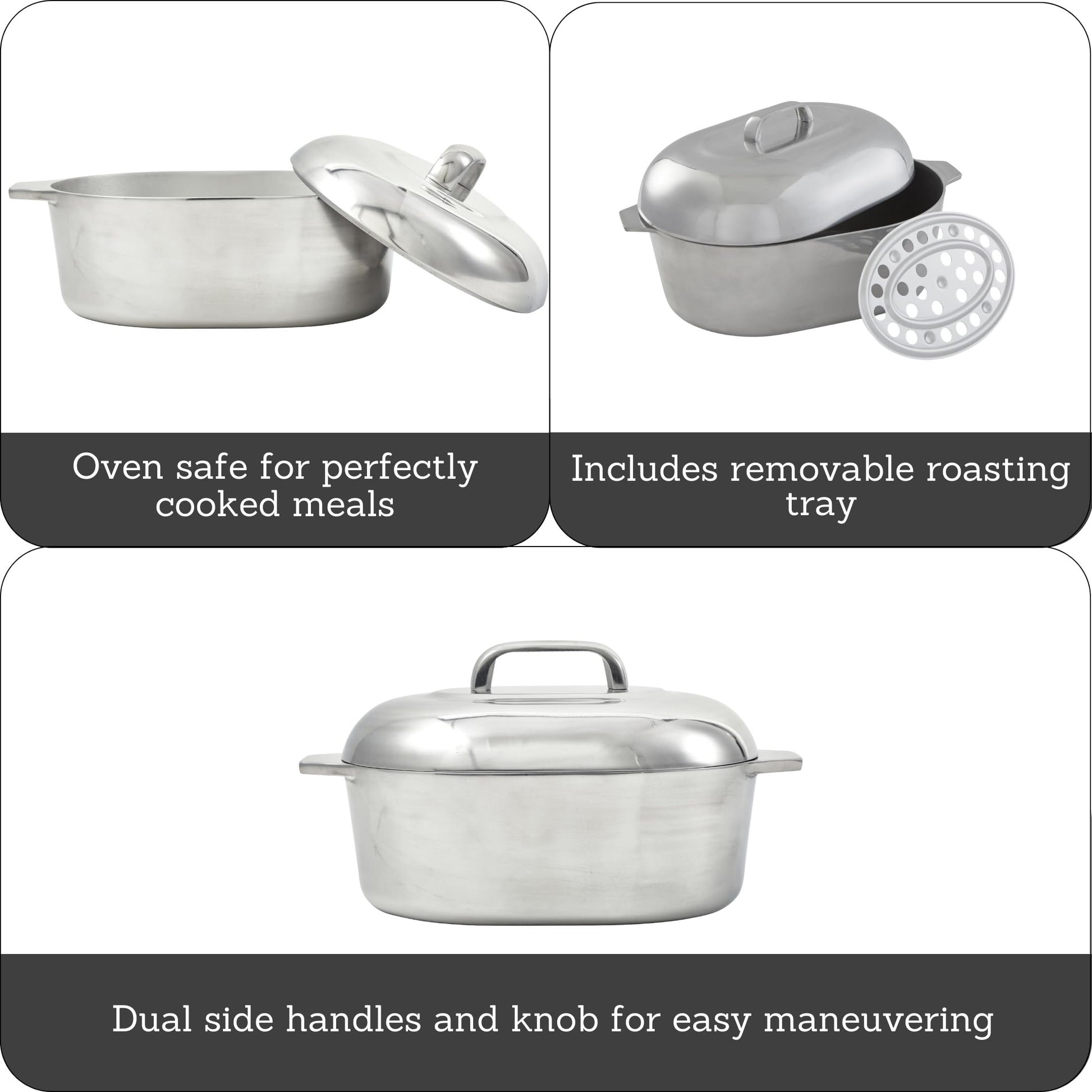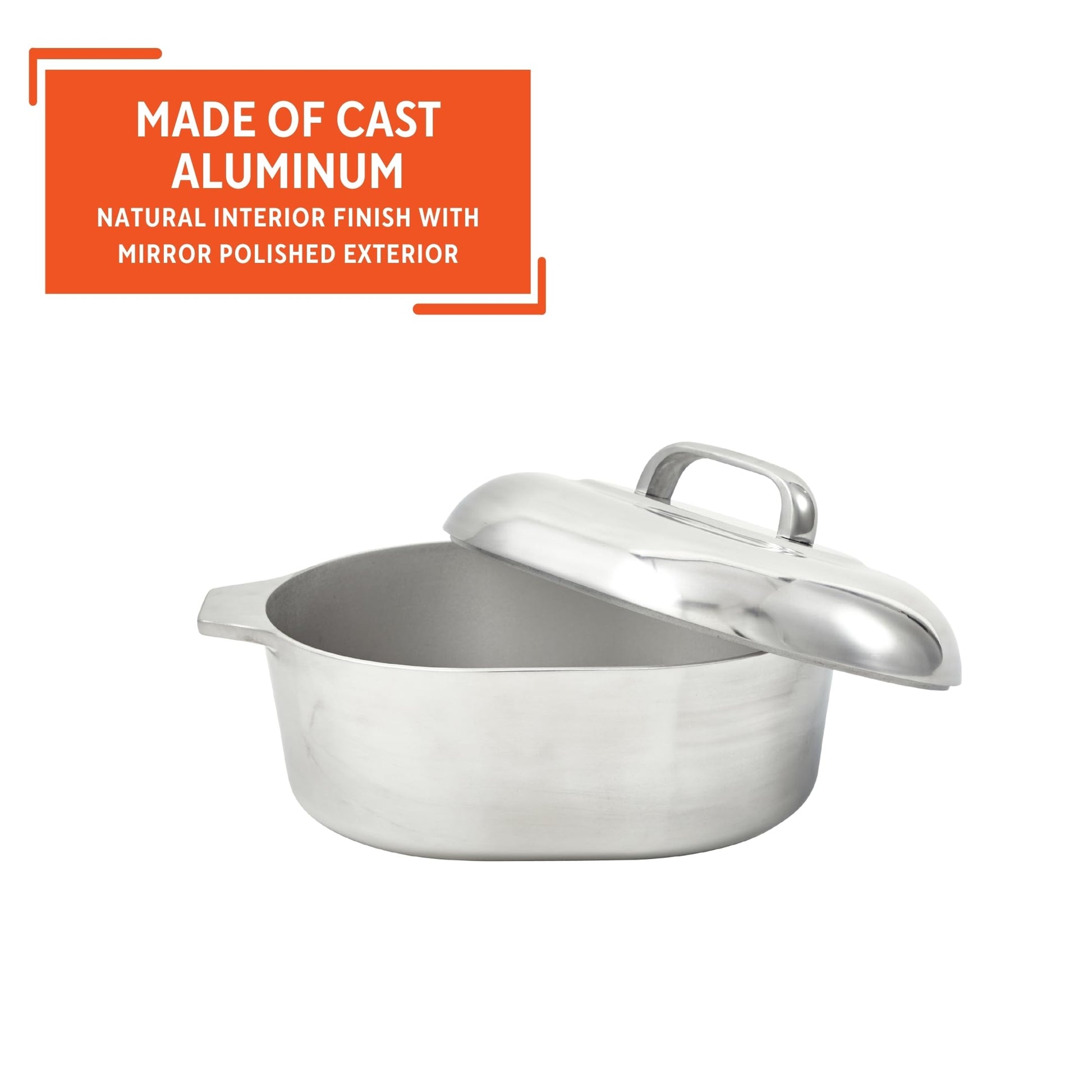 • Natural Interior Finish.Mirror Polished Exterior.Aluminum Side Handles & Knob for Easy Transport.Ideal for Roasting, Steaming and More