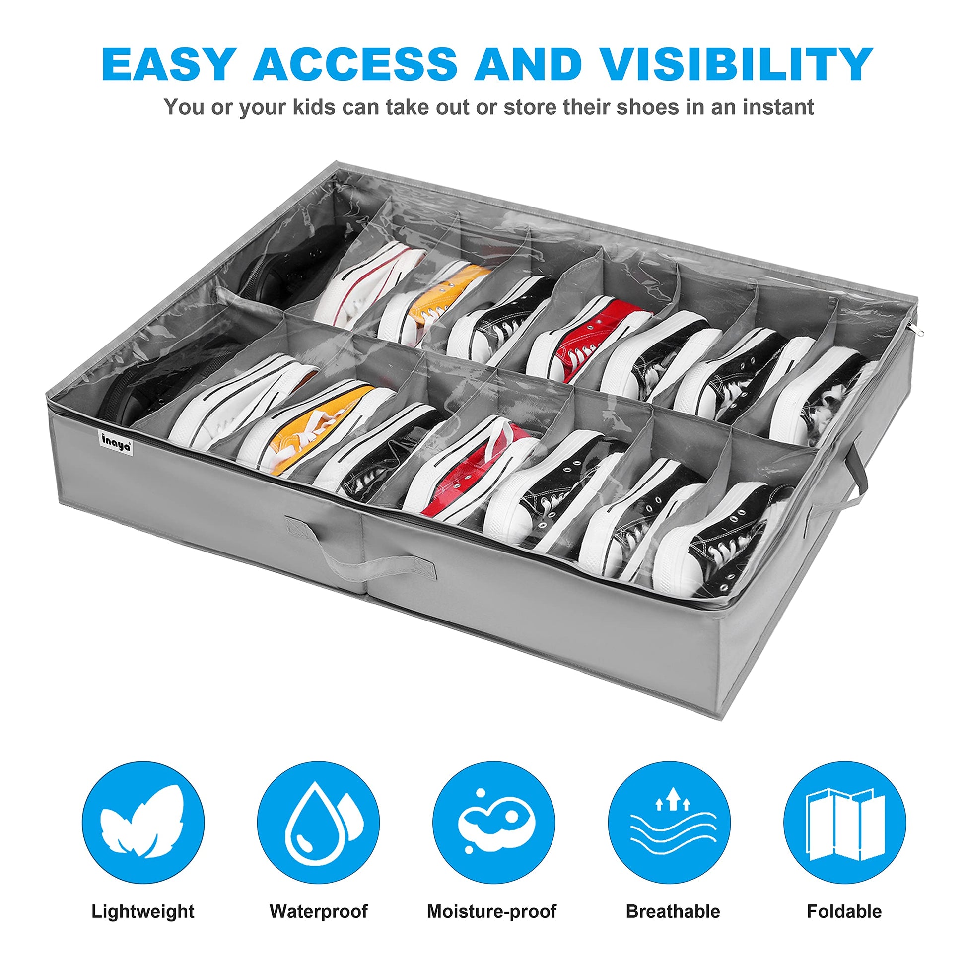 • ✔️SIMPLE SHOE STORAGE SOLUTION - Shoe racks are nice, but they neither fit so many pairs of shoes nor Dust-proof. The trick to an organized home is making the most of small unused spaces. Use this shoe organizer to store 32 pairs of shoes under your bed. This shoes storage is the ideal solution for any woman with a shoe addiction or moms with too many kids shoes flying around the house.