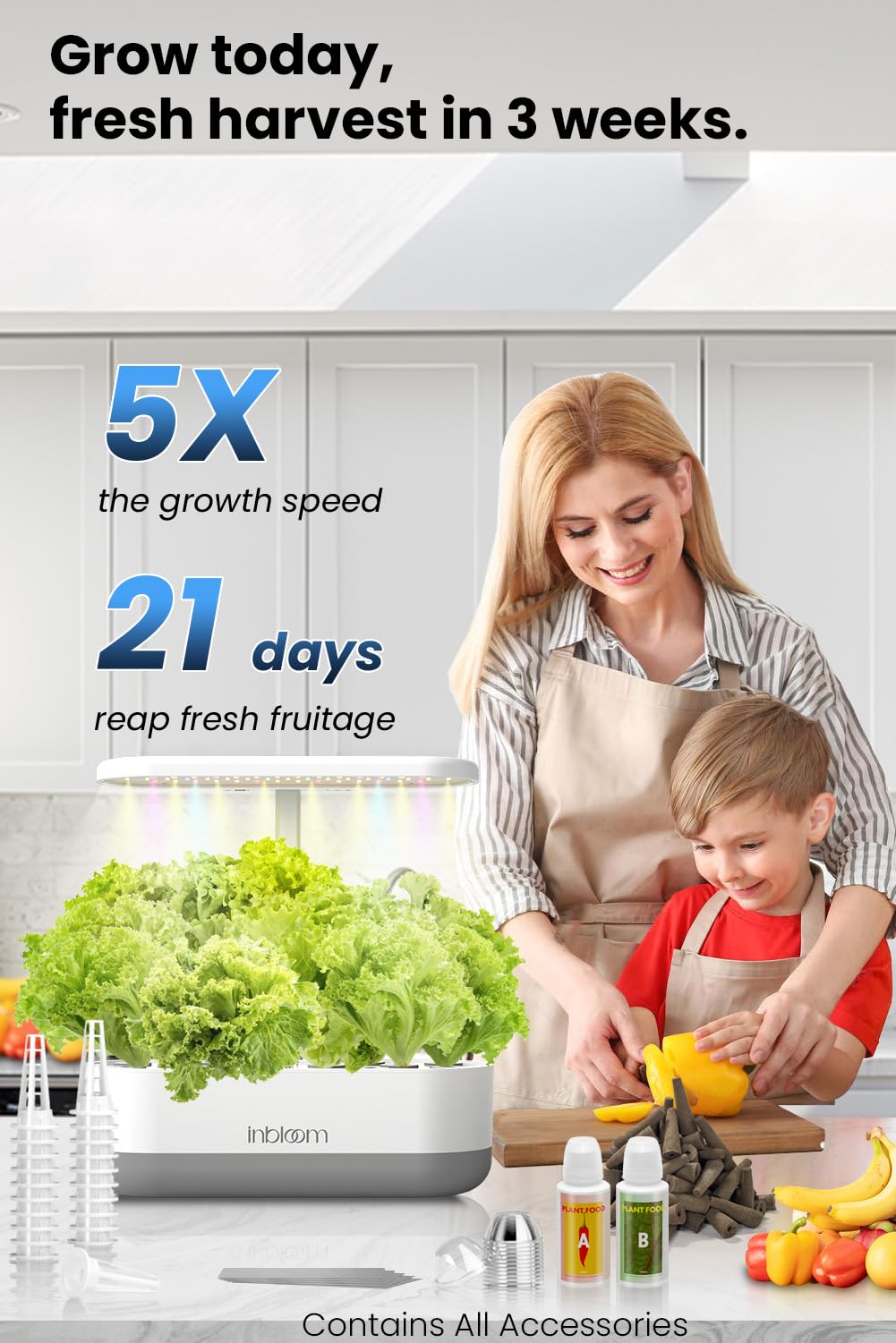 inBloom 12 Pods Hydroponics Growing System Indoor Garden with LED Grow Light and Pod Kit, Plants Germination Kit with 4.2L Water Pump Accelerate, Height Adjustable, Gardening Gifts for Women, White