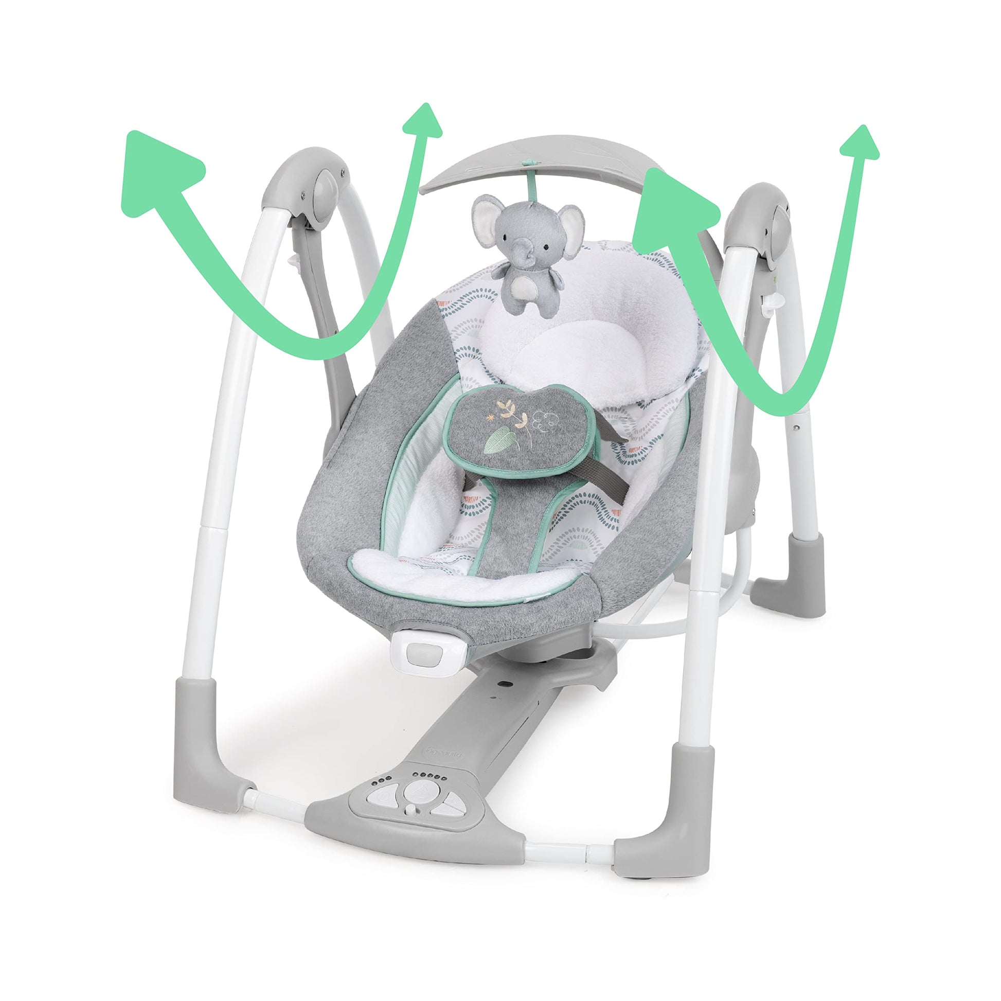 Details: Your newborn can swing or sit in comfort with the Swell Portable Swing from Ingenuity. When your infant wants to sway, the automatic swing setting will calm and comfort. Quickly and easily convert it into a stationary seat with our secure EasyLock system. In either mode, baby can enjoy soothing vibrations. This travel friendly baby swing features a foldable design so it can lay flat for easy storage and portability. Soothe your little one with 5 swing settings, 12 melodies and 4 nature sounds or keep him entertained with plush elephant toy included. When you need to scoop up your baby, our innovative leaf-shaped toy bar easily pivots out of the way. Power the swing motion and music with the included USB cord, while 1 C battery powers the vibration unit. When things get messy, remove the machine washable seat pad and headrest for easy cleaning. With a gender neutral design and plush fabrics, this swing makes a great baby shower gift idea for boy or girl. This compact and take along swing-to-seat is ready for the ride wherever you need to go. Use from age 0 to 9 months or up to 20 lbs.