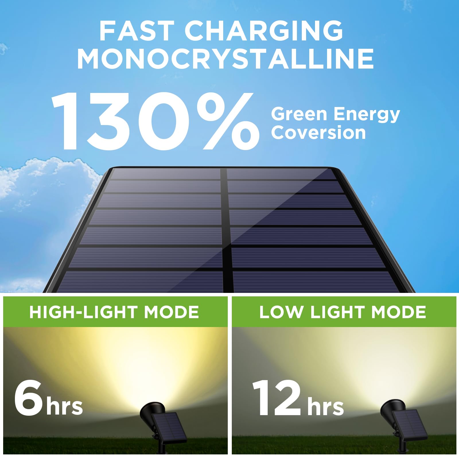 • Improved Brightness & 2 Working Modes: With super brightness, this solar spotlight can cast a focused ray to highlight your flagpole or beautiful sculpture, even on the darkest of nights. You have the option to set from High Mode (MAX 6Hrs) to Low Mode (MAX 12Hrs) to extend working time.