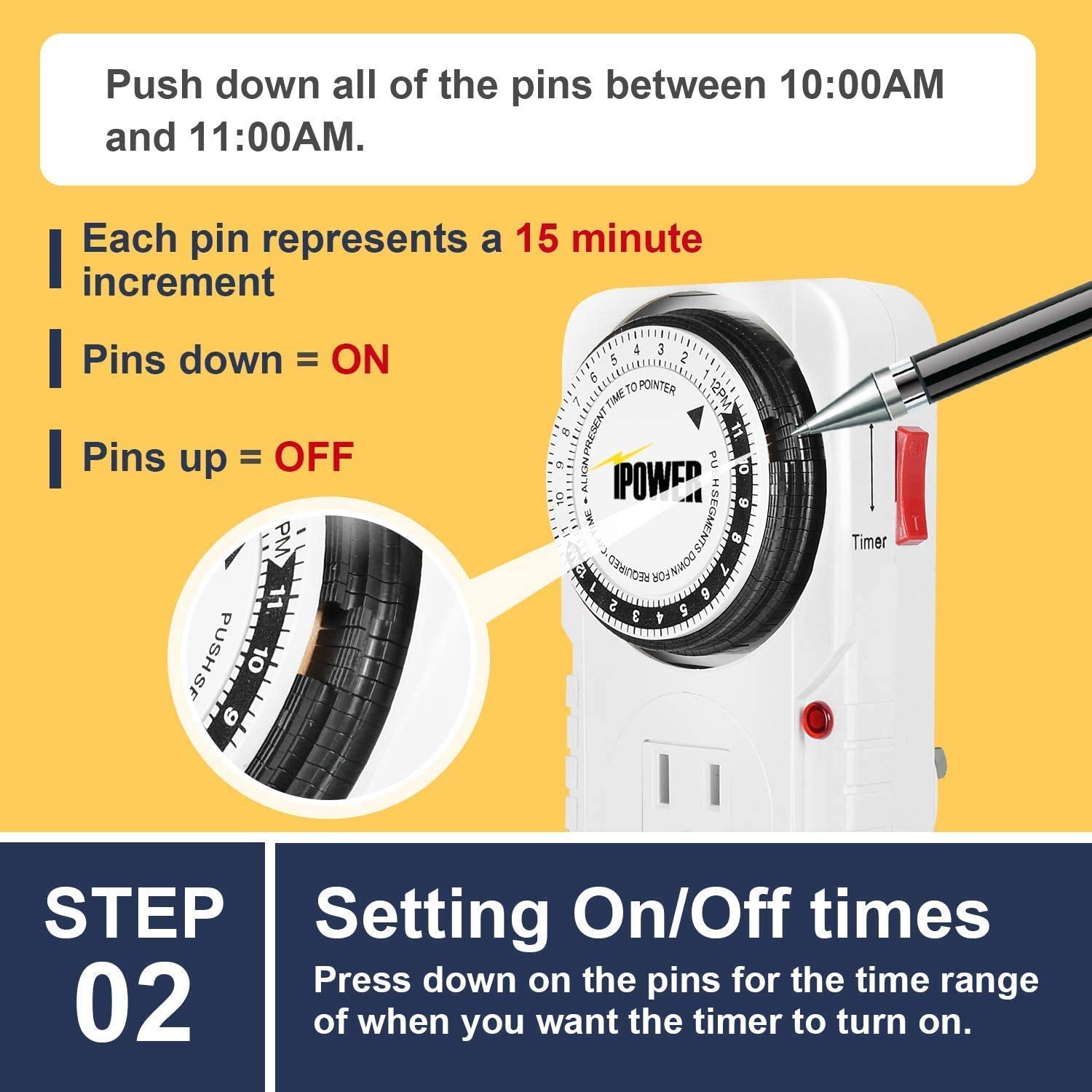 Easy to use: built-in pin dial that allows you to set your timer by pressing the toggle pins down for ON, or keeping them up for OFF