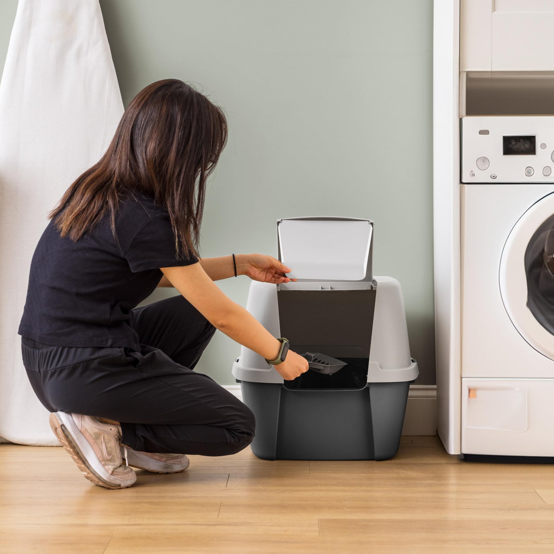IRIS USA Cat Litter Box with Front Door Flap and Scoop, Covered Kitty Box with Handle and Buckles for Portability and Privacy, Dark Gray