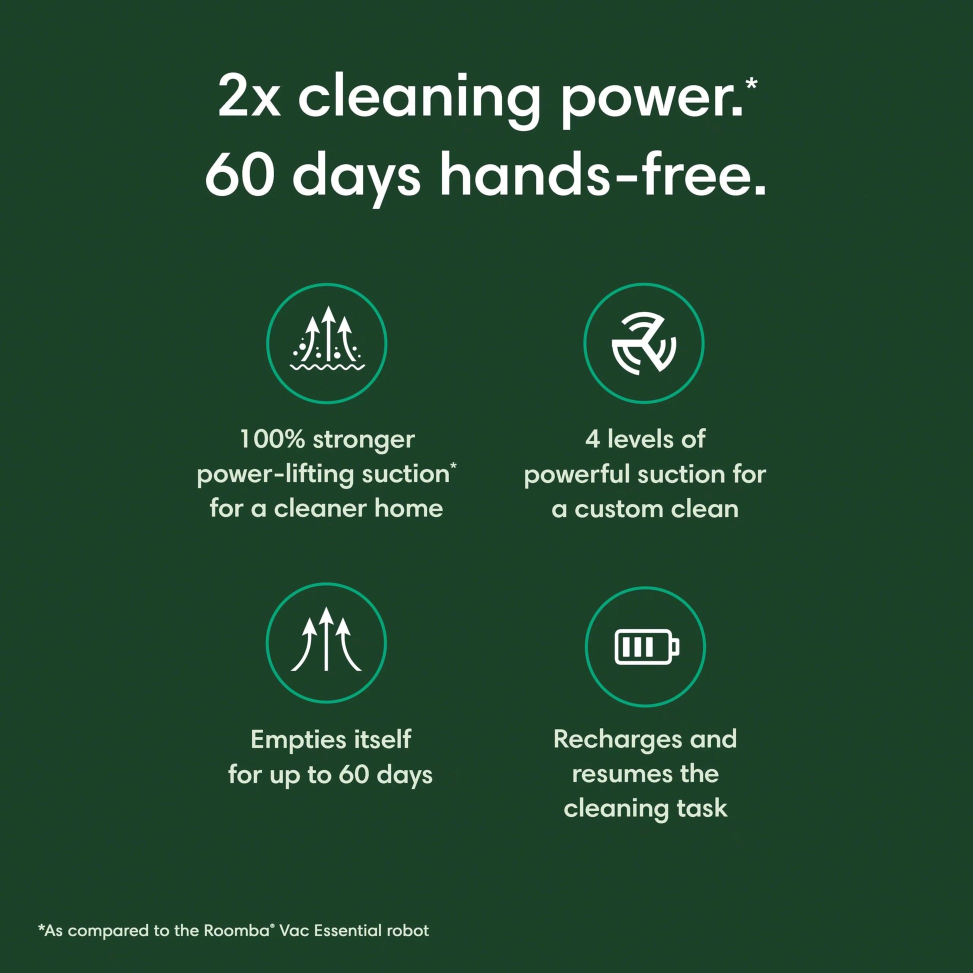 • CHECK VACUUMING OFF YOUR LIST. Effortless to use, the Roomba Vac 2 robot + AutoEmpty dock not only has 2x cleaning power* but it also empties on its own into a bag that holds up to 60 days of dirt and debris. *As compared to the Roomba Essential robot