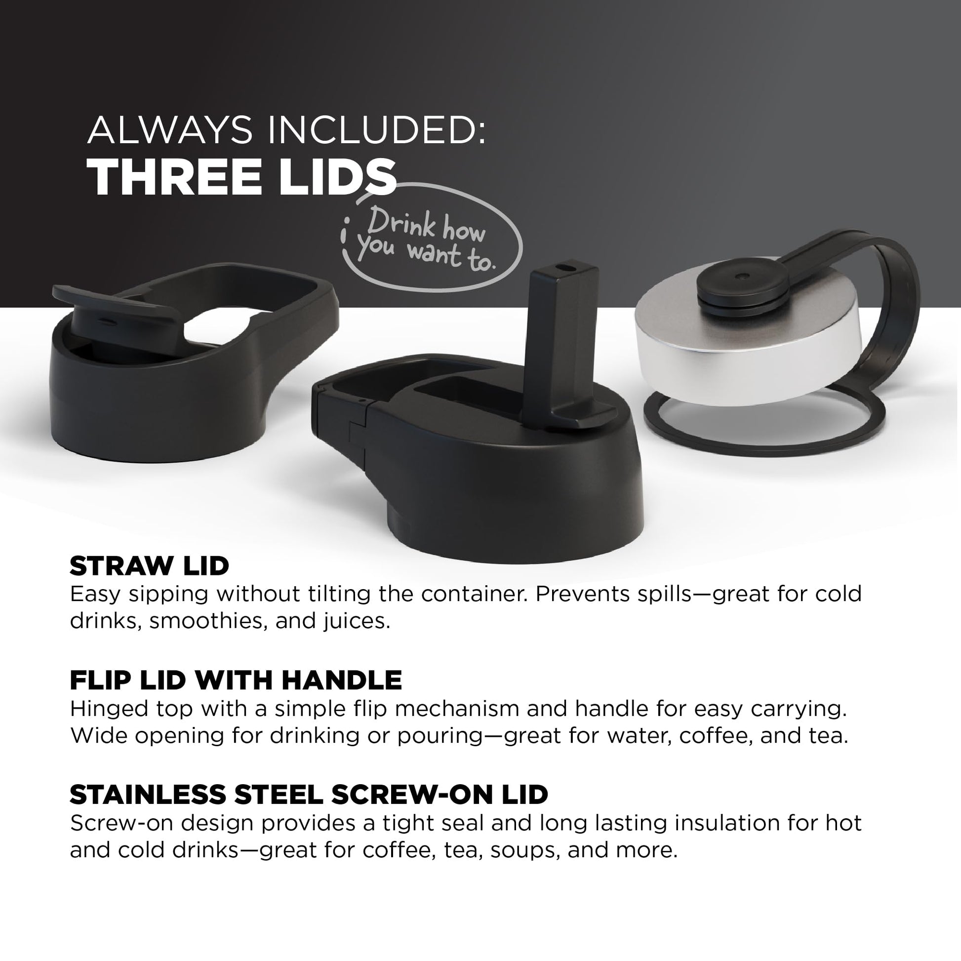• 3 LIDS: YES, Iron Flask comes with THREE different leakproof lids. Carabiner Straw Lid with 2 Straws, Flip Lid, and a Stainless Steel Lid! *NOTE: The stainless steel lid is plastic from inside and stainless steel from outside*
