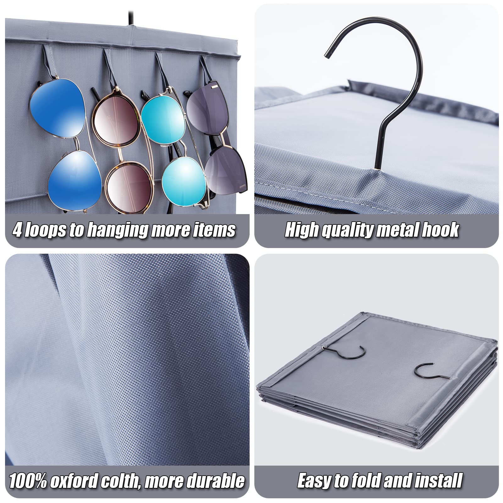 • 2 in 1, Unique Design - The baseball hat organizer is designed a unique 2-in-1 that allows you to hang it vertically or horizontally. It has 2 metal hooks that fit on closet rods or garment racks. It also has 4 cloth loops on the top of both sides to hang sunglasses.