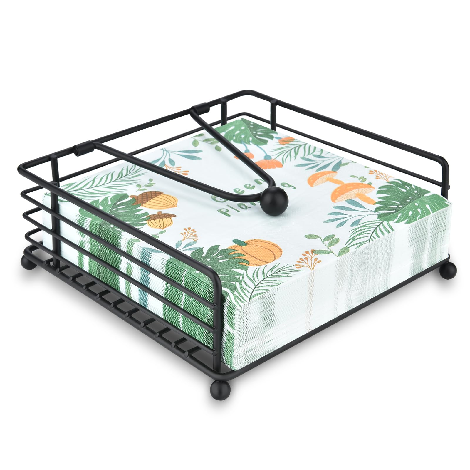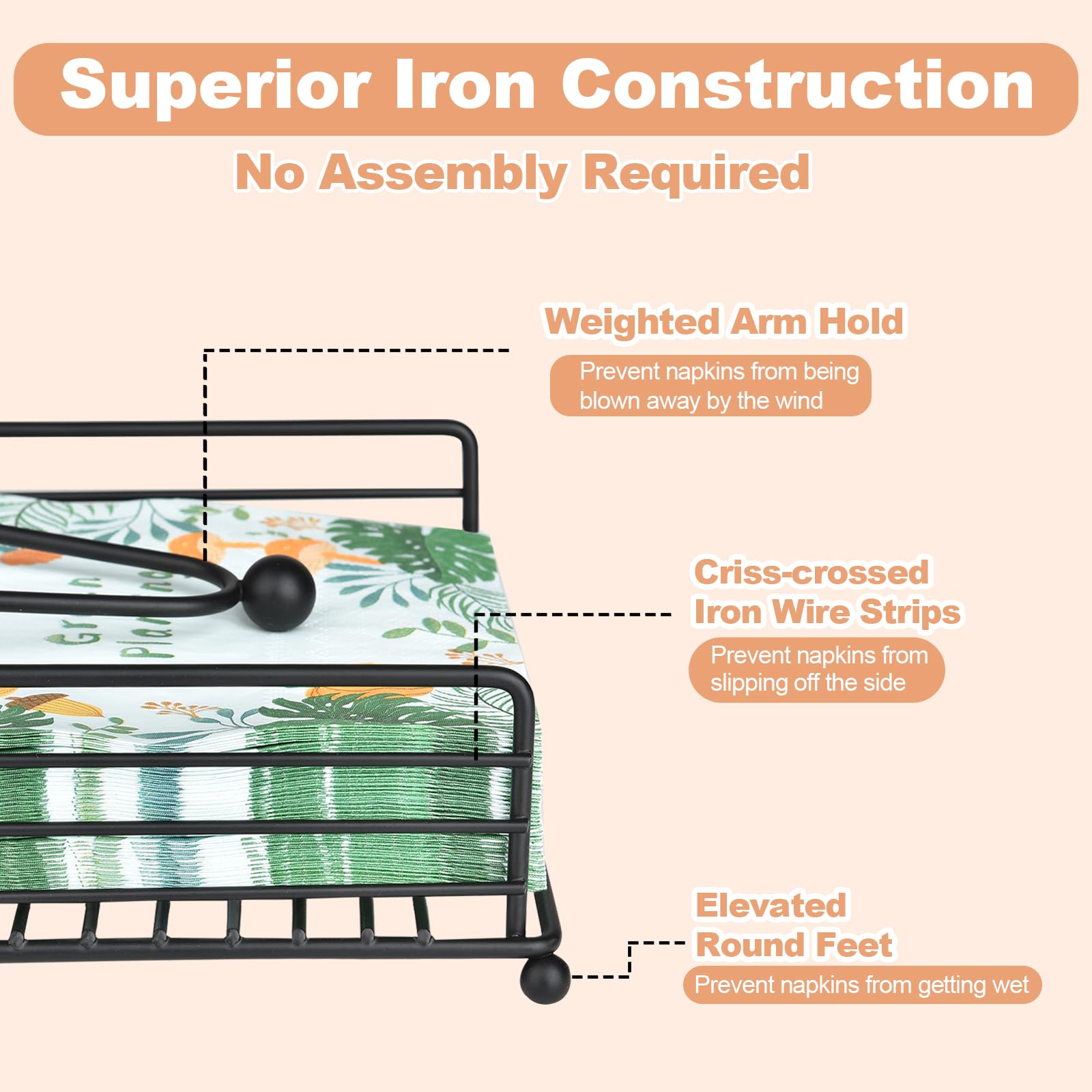• ROBUST IRON CONSTRUCTION, ENDURING QUALITY: Crafted from high-quality iron in a chic black finish, our napkins holder exudes durability and timeless elegance. Its steady structure ensures stability while accommodating approximately 80 standard napkins, providing enduring functionality for your home or outdoor gatherings.