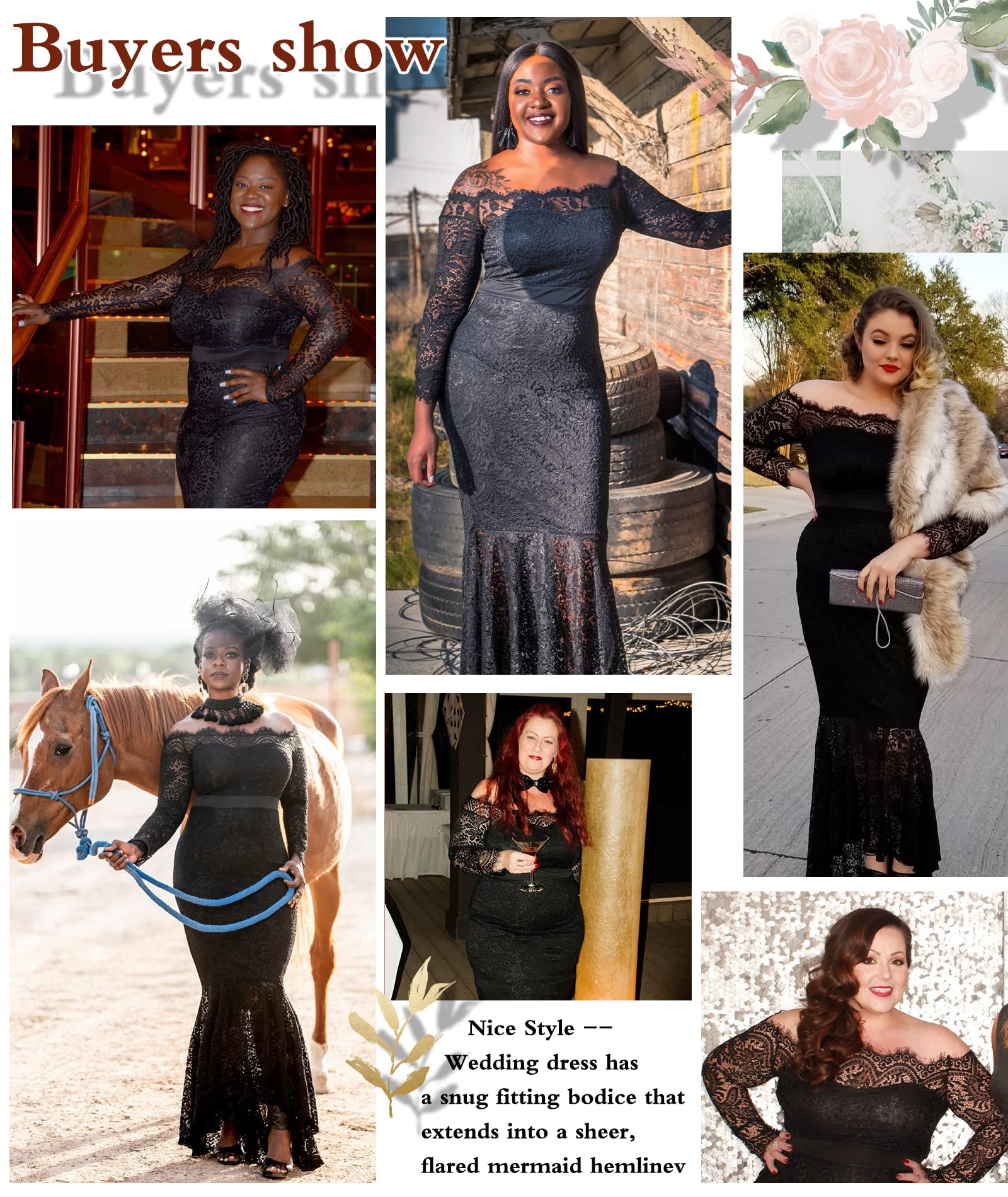 LALAGEN Women's Floral Lace Long Sleeve Off Shoulder Wedding Mermaid Dress Black XL