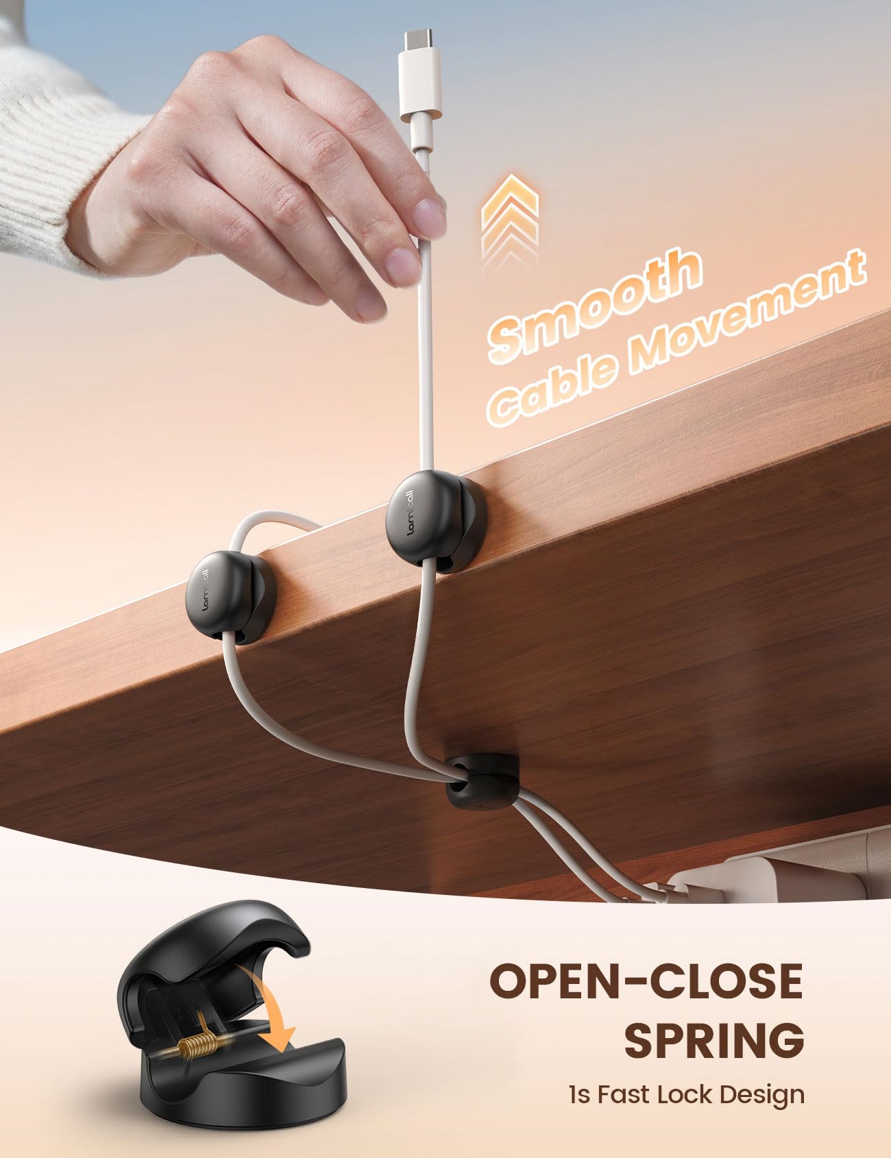 • 【Spring Open-Close Mechanism】 Our cord holder clips feature an innovative spring action mechanism, combined with an angled opening design, allowing for one-handed, quick, and secure placement and removal of your charging cords, HDMI cables, and more [After installation, wait for 30 minutes to ensure the best adhesion effect]